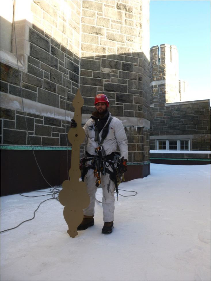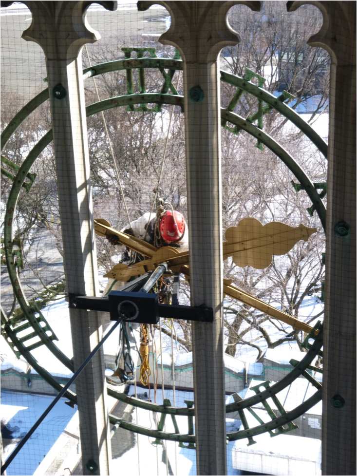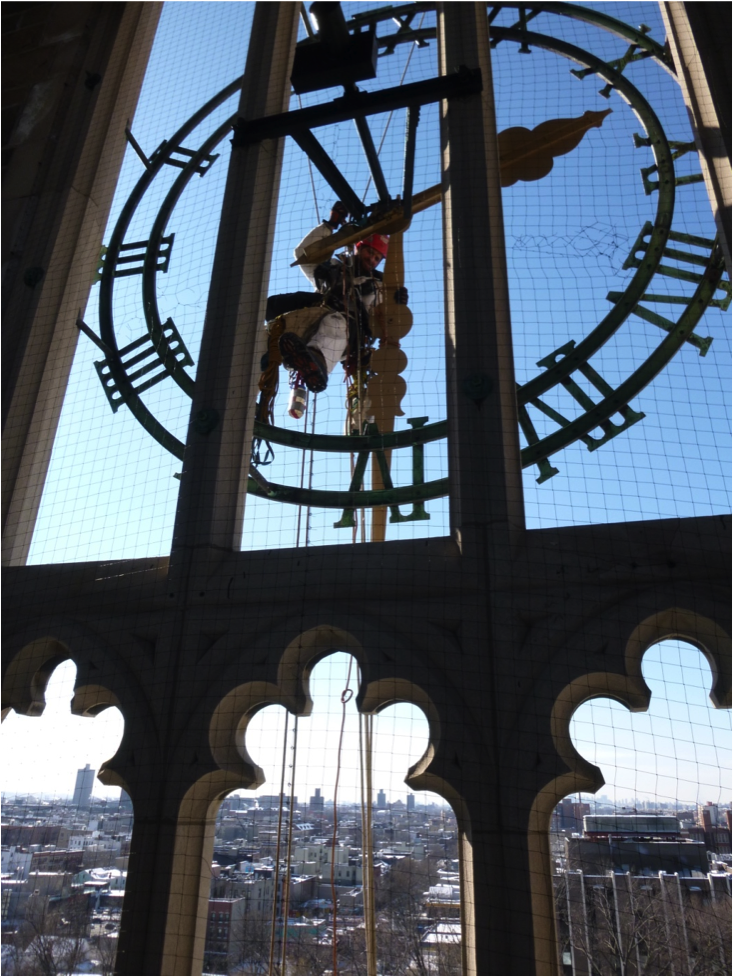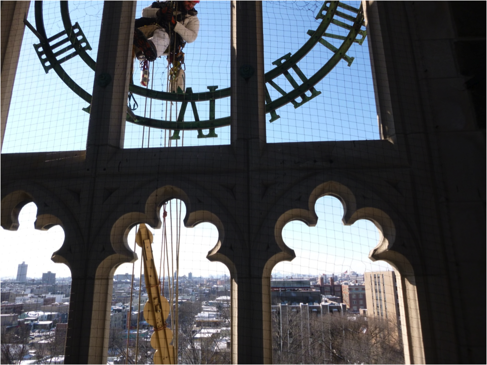The crenellated parapet at the top of the tower on Keating had bird protection on the top of the walls so we had to lower ropes through the crenels and climb up to the clock which was about a 150’ climb from the roof of the main building below.
