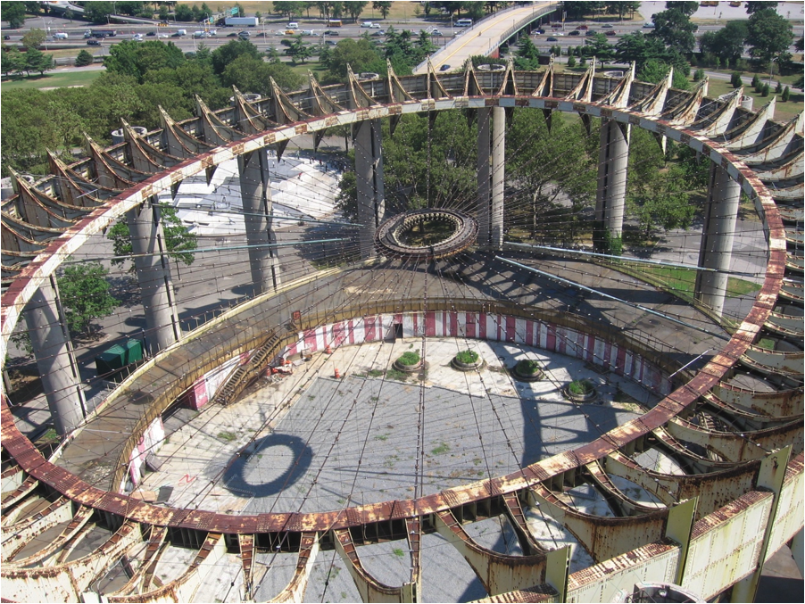 Predicted by its organizers to be the “greatest single event in history,” the 1964-65 New York World’s Fair was indeed a spectacle. One of the most notable structures of the Fair, and one of the few that still stands, is the New York State Pavilion. Looking to create a symbol of progress and to show off the state’s status as host of the Fair, Governor Rockefeller commissioned Philip Johnson, who worked with structural engineer Lev Zetlin, to design the New York State Pavilion. The pavilion was in fact an assemblage of three separate structures: the open-air Tent of Tomorrow, three interconnected Observation Towers, and the circular Theaterama.