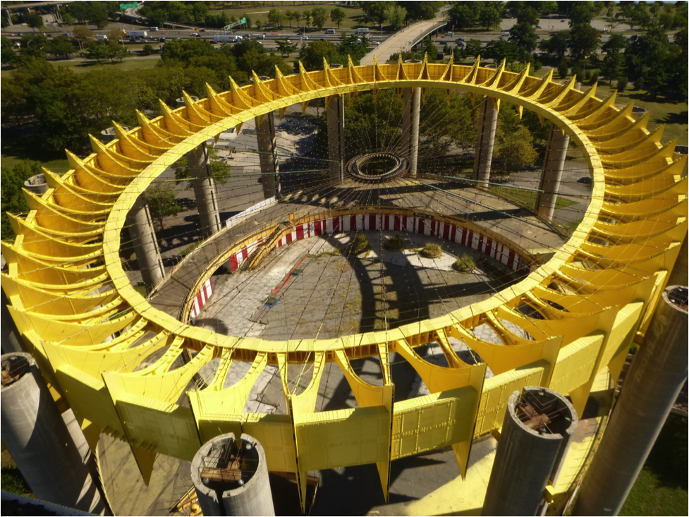 Although unused for over forty years, the Tent of Tomorrow is showing new life thanks to the work of New York area painters. The City of New York Department of Parks and Recreation (DPR) who owns the structure, teamed with the New York Structural Steel Painting Contractors Association and the International Union of Painters and Allied Trades, Local 806 (Structural Steel and Bridge Painters of Greater New York) to complete a spectacular painting project during the summer of 2015.