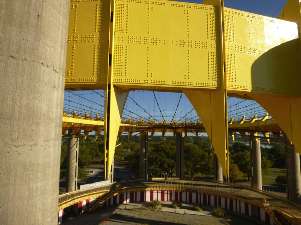 Labor for the painting project was donated through apprenticeship programs of the trade groups. Funding to provide meals for the crew during the work was raised through crowdsourced funding. The paint job not only returns the steel elements of the Tent of Tomorrow to their original appearance, it also helps to protect the structure from continued corrosion and deterioration. The painting project is one step in the long process being undertaken by DPR and the borough of Queens to stabilize and hopefully one day restore the Tent of Tomorrow and Observation Towers of the New York State Pavilion.