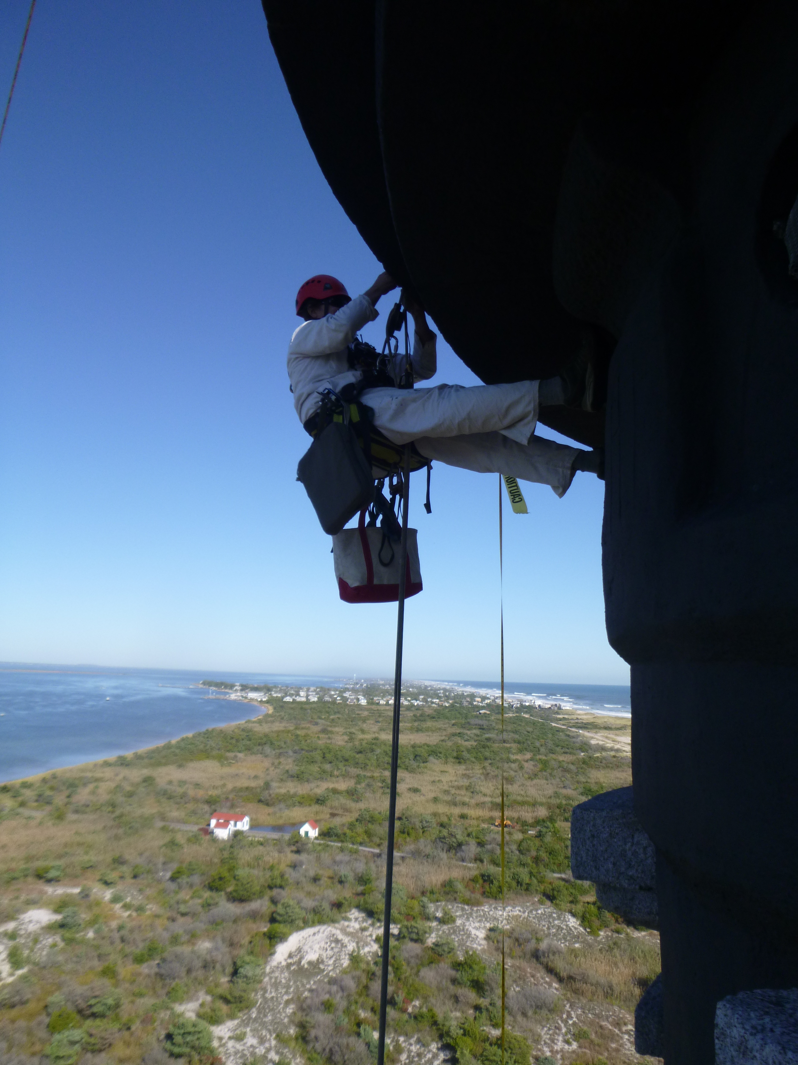 The week of October 5, 2015 was a busy one at the Fire Island Lighthouse on the Great South Bay of Long Island, NY. In addition to several 4th grade school groups climbing the 192 steps to reach the top of the lighthouse each day, a team of consultants working with the National Park Service and Fire Island Lighthouse Preservation Society were on site to perform an investigation of the exterior. The team led by John G. Waite Associates, Architects with Old Structures, Atkinson-Noland & Associates, and Vertical Access was tasked with assessing the exterior concrete coating of the lighthouse.