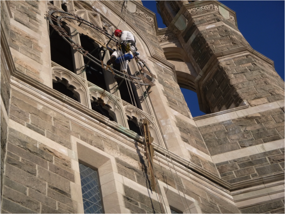 To access the underside of the beams, the much more strenuous “beam rolling” technique was employed. Hanging from two or three beam clamp anchors, we would shimmy along the bottom flange of the beam. Beam rolling is tiring, because of its constant, free-hanging nature.