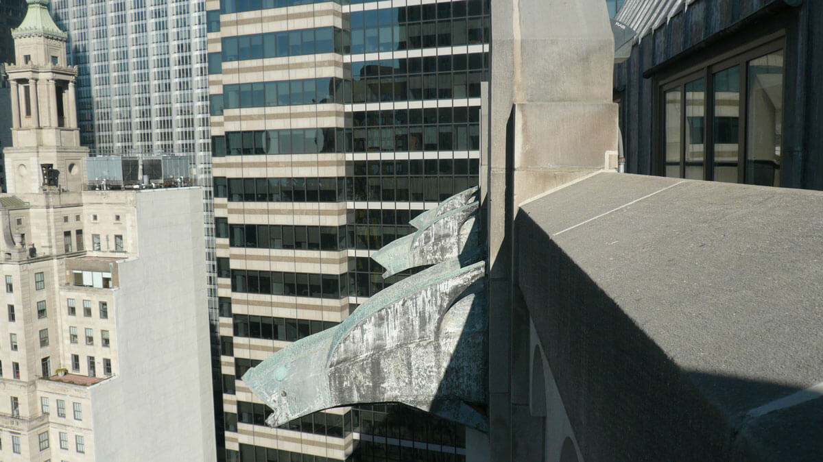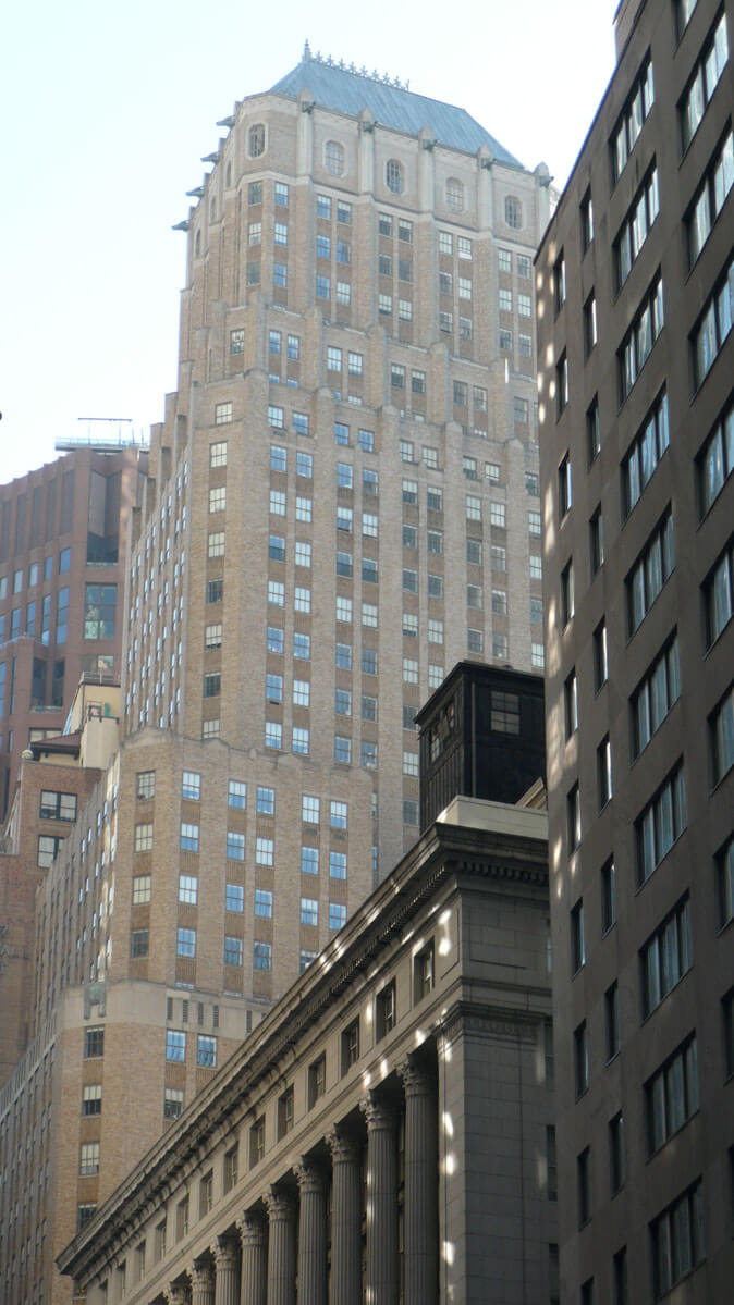 Also known as the Wall and Hanover Building, 63 Wall Street was designed by Delano & Aldrich and completed in 1929 as the headquarters of Brown Brothers & Company, a private bank that became Brown Brothers Harriman & Company in 1931. The bank operated at 63 Wall Street until 2003 when the building was converted to residential units. The building is 37 stories tall with several setbacks. The lowest four floors are clad in limestone with restrained neo-classical ornament, while the upper floors are primarily clad with iron spot brick with limestone parapets and window sills. Copper sheet metal grotesques in the shape of flying fish project from the limestone piers on the north, west and south façades at the 37th floor. Above the 37th floor is a double-hipped, lead-coated copper standing seam roof topped with cresting.