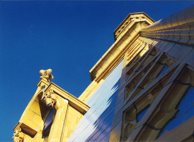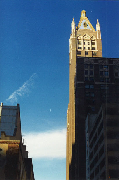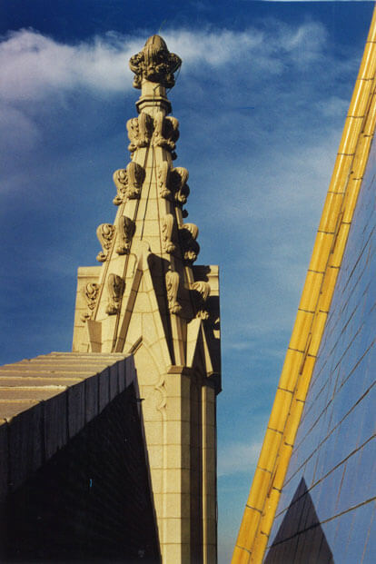 680 N. Lake Shore Drive is a steel and reinforced-concrete framed building clad in brick with stone and terra cotta ornament. Its west façade consists of an 8-story tower atop a 21-story base. The tower is topped with a pyramidal roof and cupola clad in blue and gold terra cotta. The interior of the steel-framed roof is fireproofed with hollow clay tile. Each of the four corners at roof level features a gothic spire of terra cotta glazed to match the limestone ornament on lower elevations of the building.
