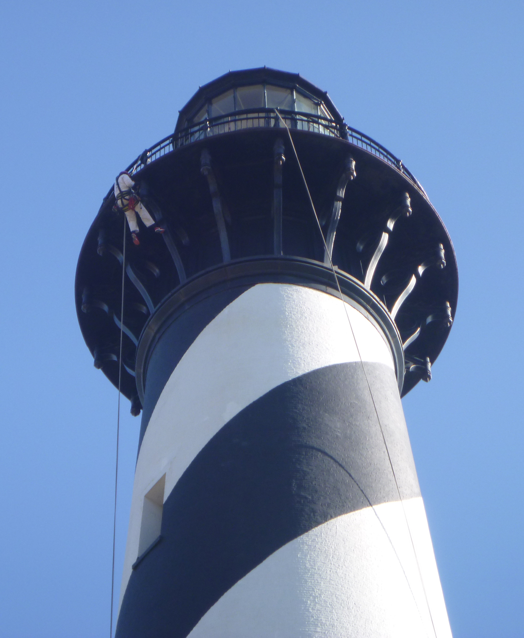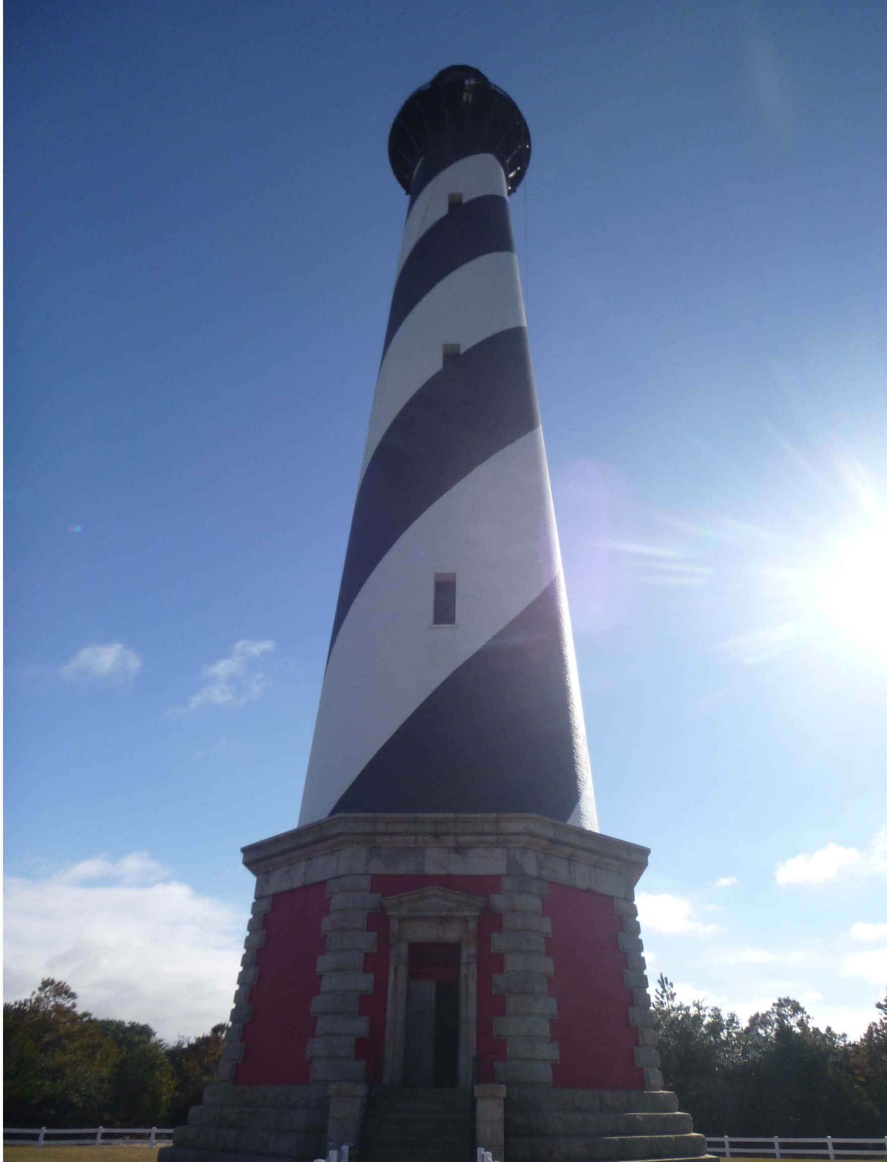 In 1794, Congress authorized the first lighthouse on Cape Hatteras to protect ships from one of the most dangerous shoals on the Atlantic coast. The current Cape Hatteras Lighthouse was built between 1868 and 1870, replacing the original lighthouse damaged during the Civil War. The lighthouse is approximately 200 feet tall, comprised of inner and outer brick walls connected by a series of twelve radial interstitial walls. The exterior displays a spiraling alternating black and white painted daymark, first applied in 1873. A cast iron spiral stair allows access to the lantern level at the interior, with landings supported by cast iron beams let into the brick inner wall. In 1999, in order to protect the light station from shoreline erosion, the lighthouse, keeper’s quarters, and other ancillary structures were moved a total of 2,900 feet to a location 1,500 feet from the ocean. The National Park Service owns the lighthouse as part of the Cape Hatteras National Seashore.