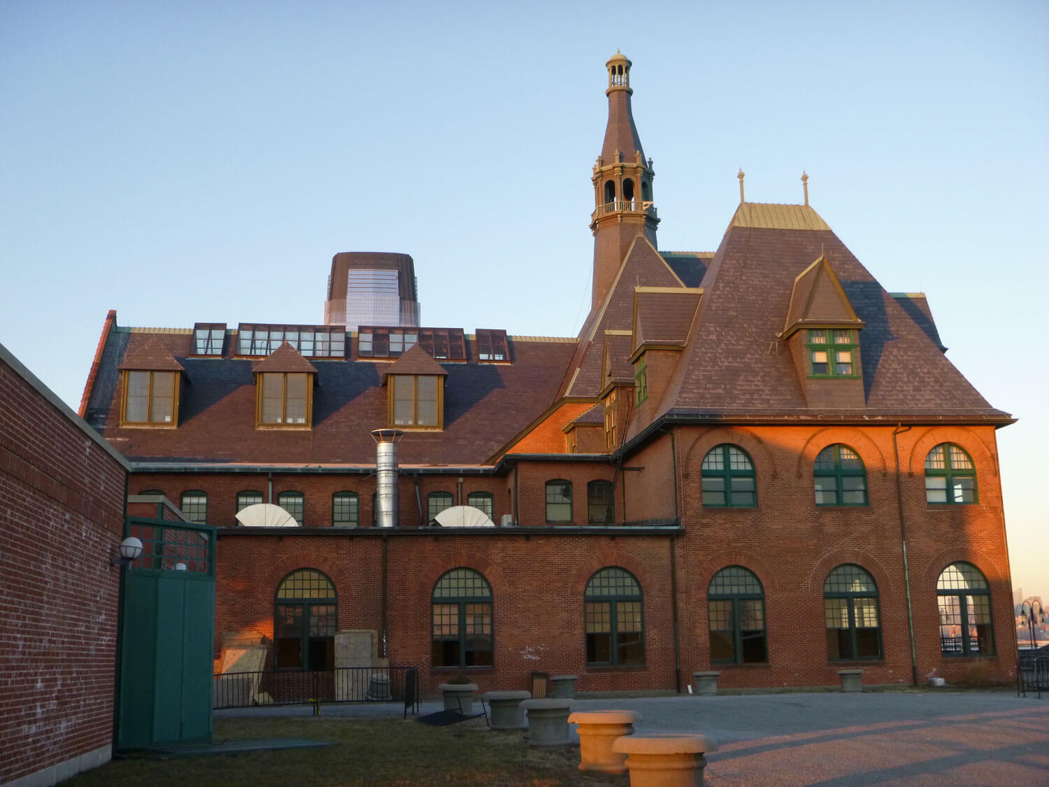 Designed by Peabody & Stearns of Boston, the red brick CRRNJ Terminal structure has Romanesque Revival elements including a steep pitched roof with dormers on the third floor, prominent arched windows, and a tower with a cupola and a clock facing the waterfront. The opening of the new terminal in 1889 occurred at the time of the heaviest immigration to the United States from Europe. It is estimated that from 1890 to 1915 nine to twelve million immigrants were processed for entry at Ellis Island and entered the country via the CRRNJ terminal. It also served as an intermodal terminal connecting ferries to Manhattan, Brooklyn and Staten Island with commuter rail lines into New Jersey.