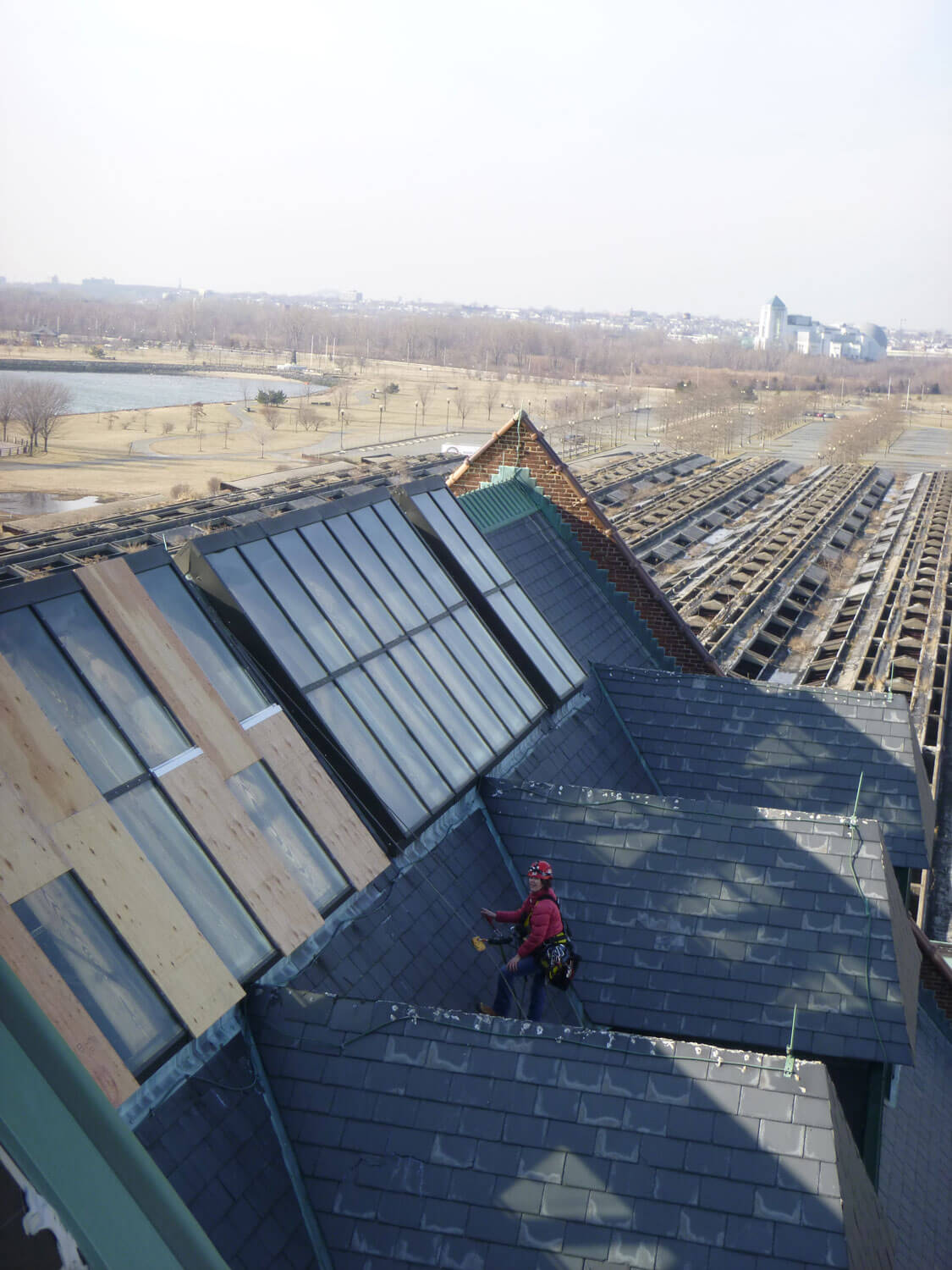 - Close visual examination of central tower and cupola, roof conditions and skylight areas.