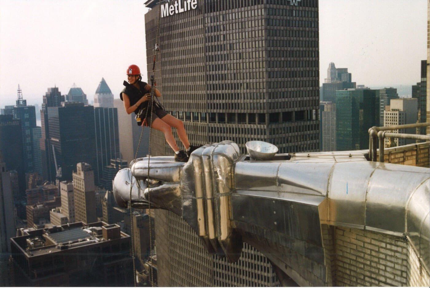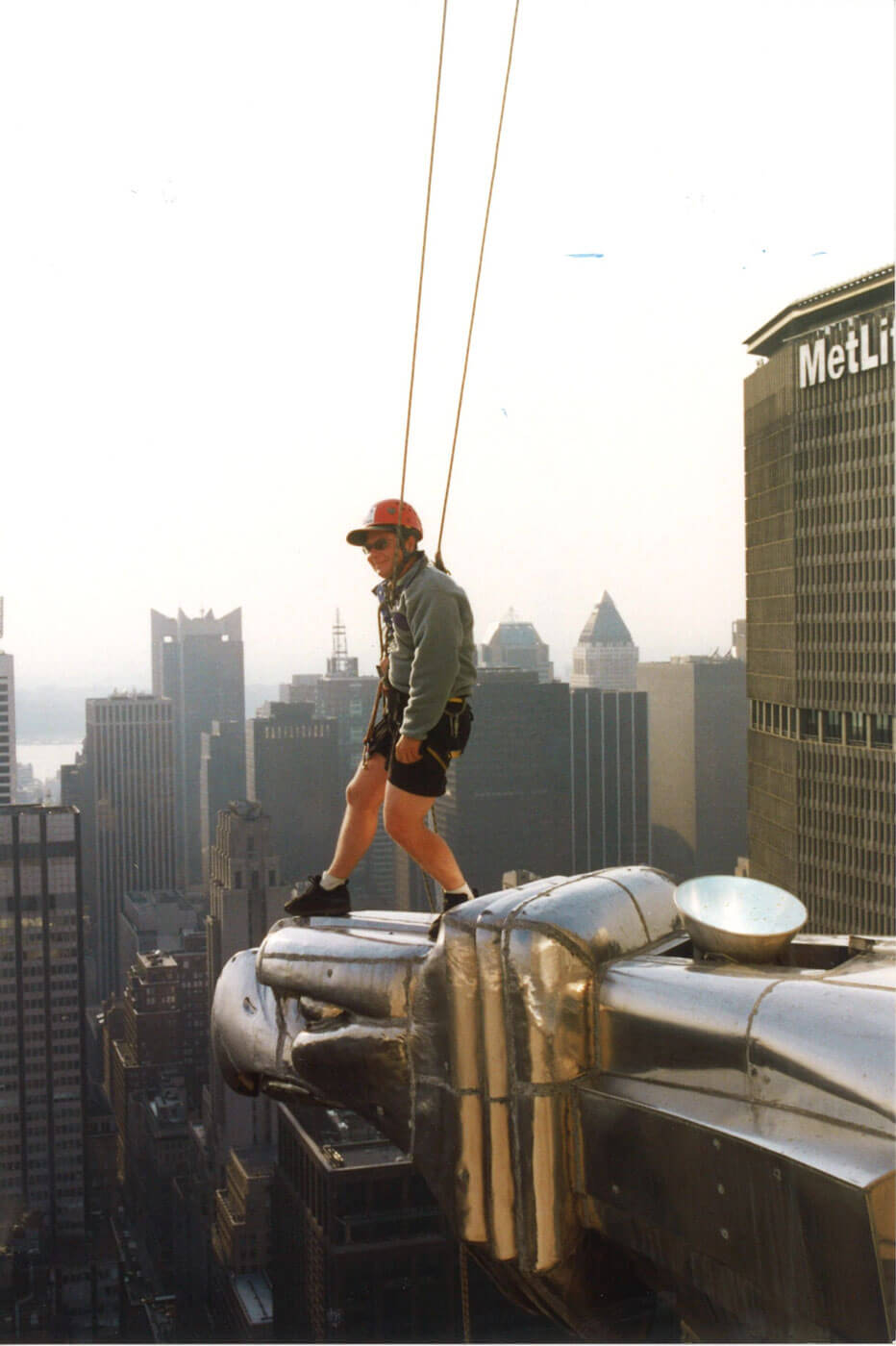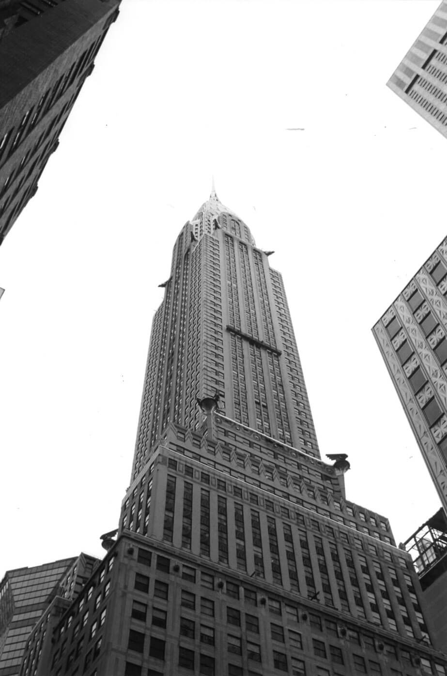 The 77-story art deco skyscraper was cited as the “most accomplished essay in the (art deco) style.” The 7-story pinnacle with stainless steel cladding and the gleaming automotive- inspired gargoyles are juxtaposed atop the more traditional light-brick cladding of the steel tower below.