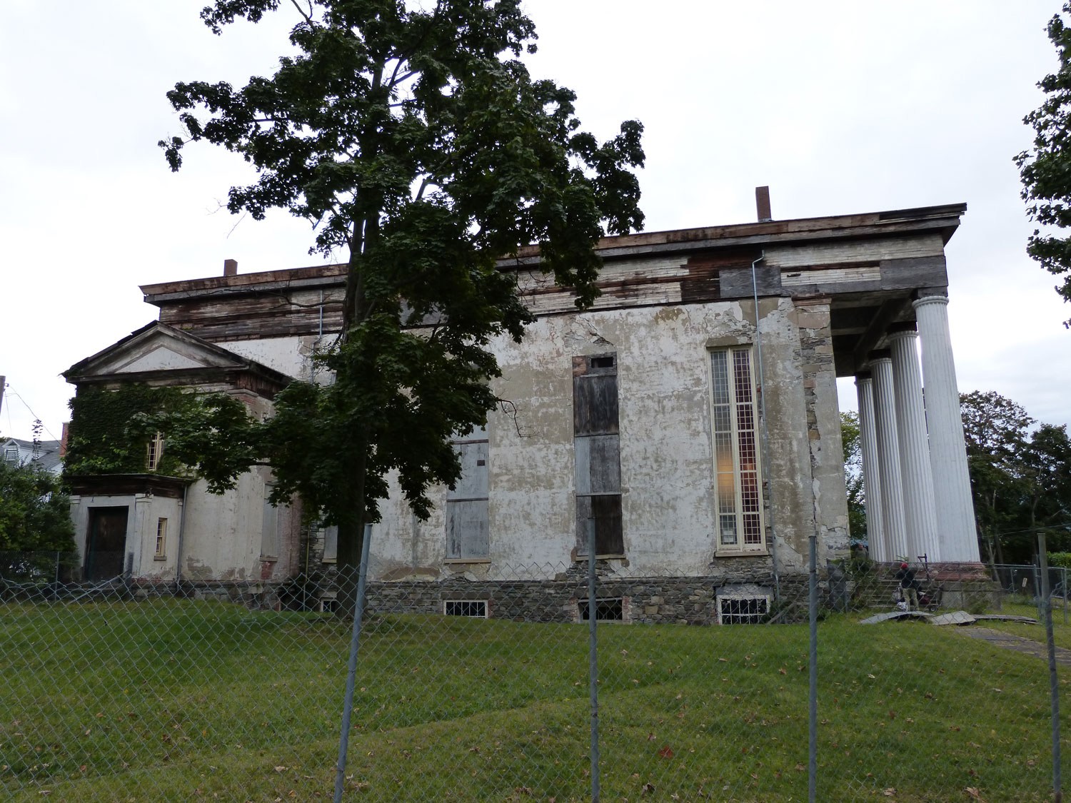 The Dutch Reformed Church in Newburgh, NY is a National Historic Landmark designed by Alexander Jackson Davis in 1835 in the Greek Revival style. Measuring roughly 50 feet wide and 100 feet long, the church is situated on a bluff above the Hudson River and oriented with its four-column portico facing south toward the center of Newburgh.