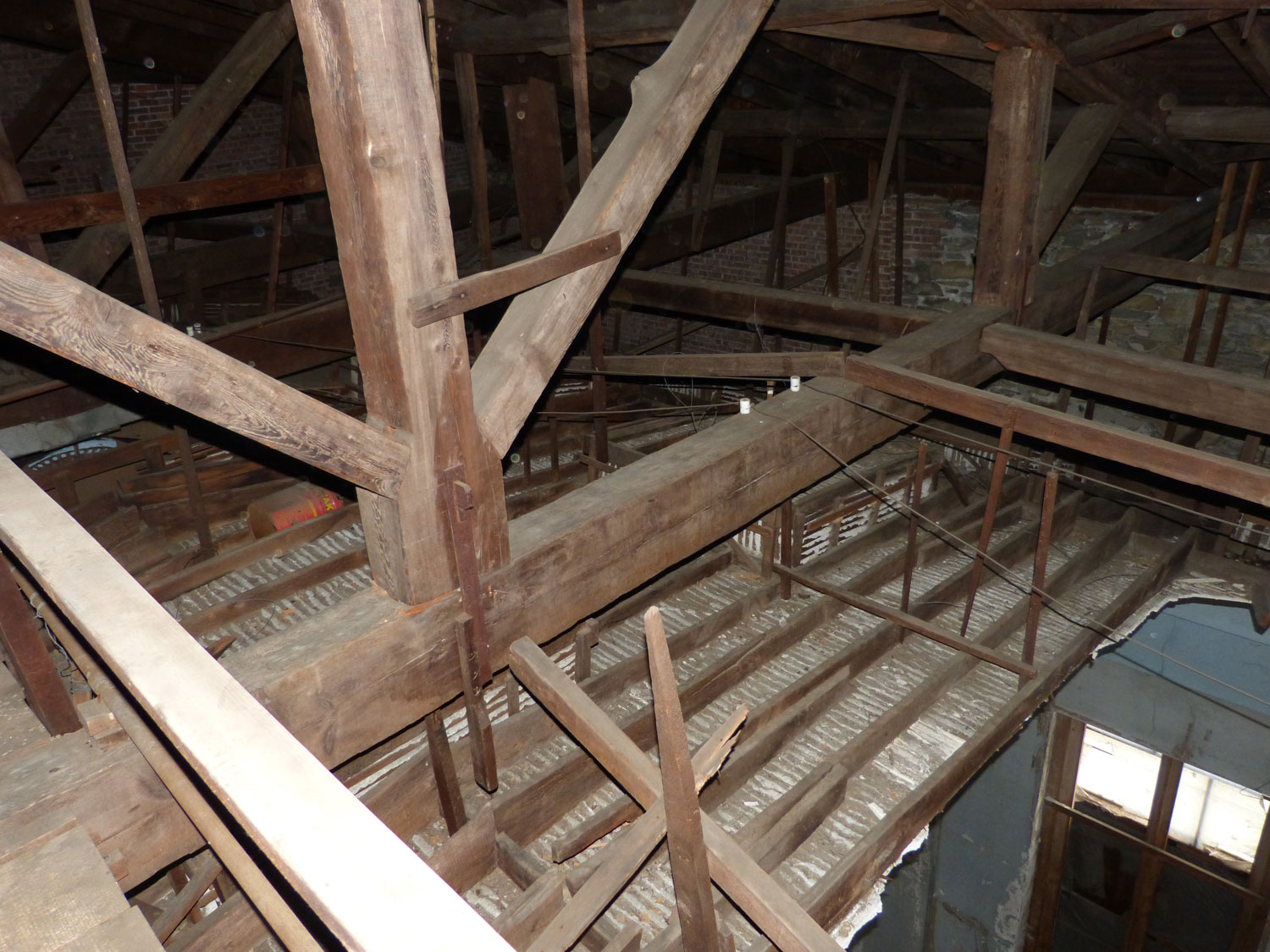 Eleven timber trusses support the gable roof. The original trusses are rough-hewn timbers with mortise and tenon joinery. The bearings of the trusses sit on top of the exterior masonry walls.