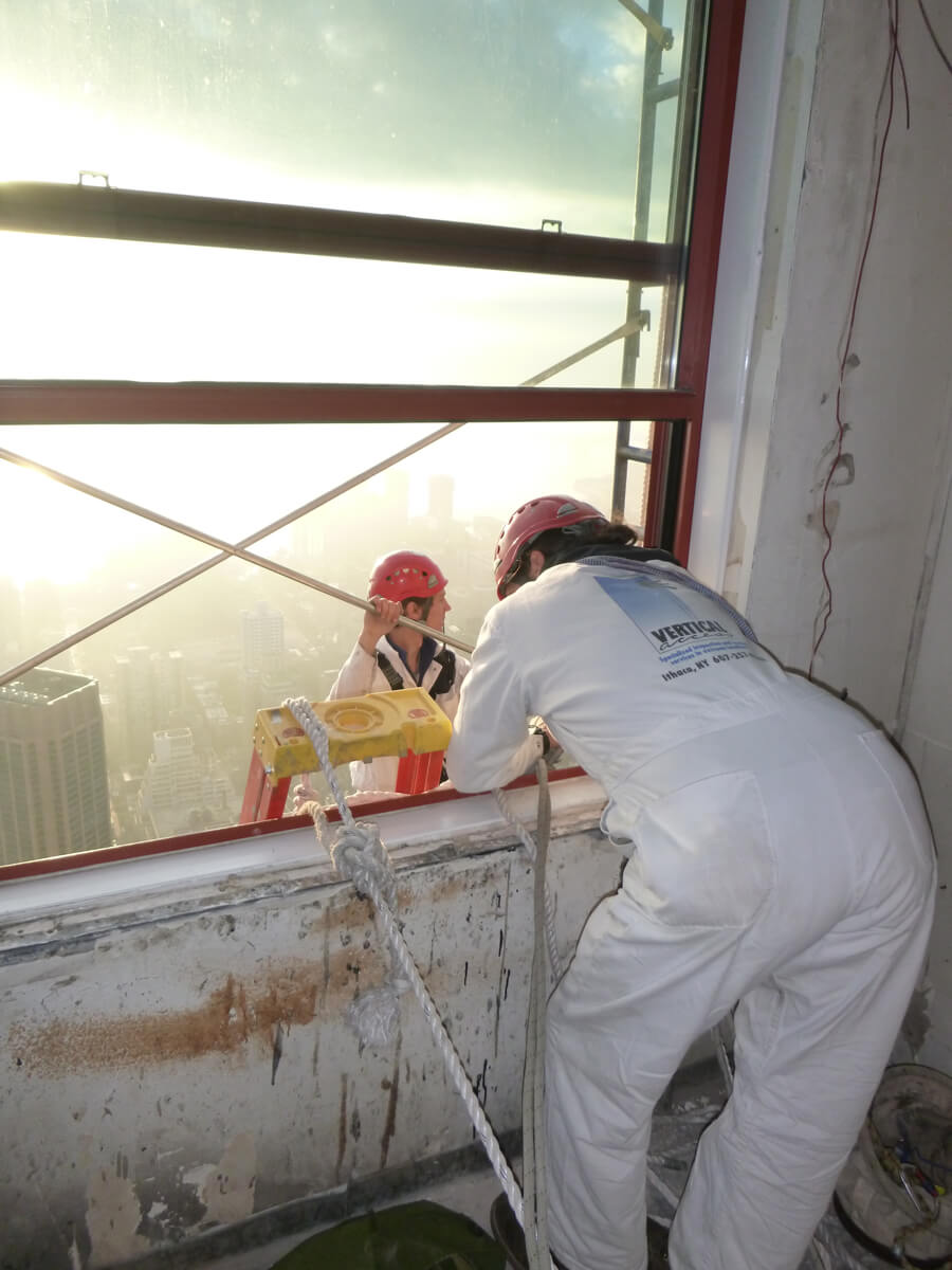 • Used industrial rope access to reach floors 81 through 85 to fasten and remove masking and to maneuver the spray rack during water testing.