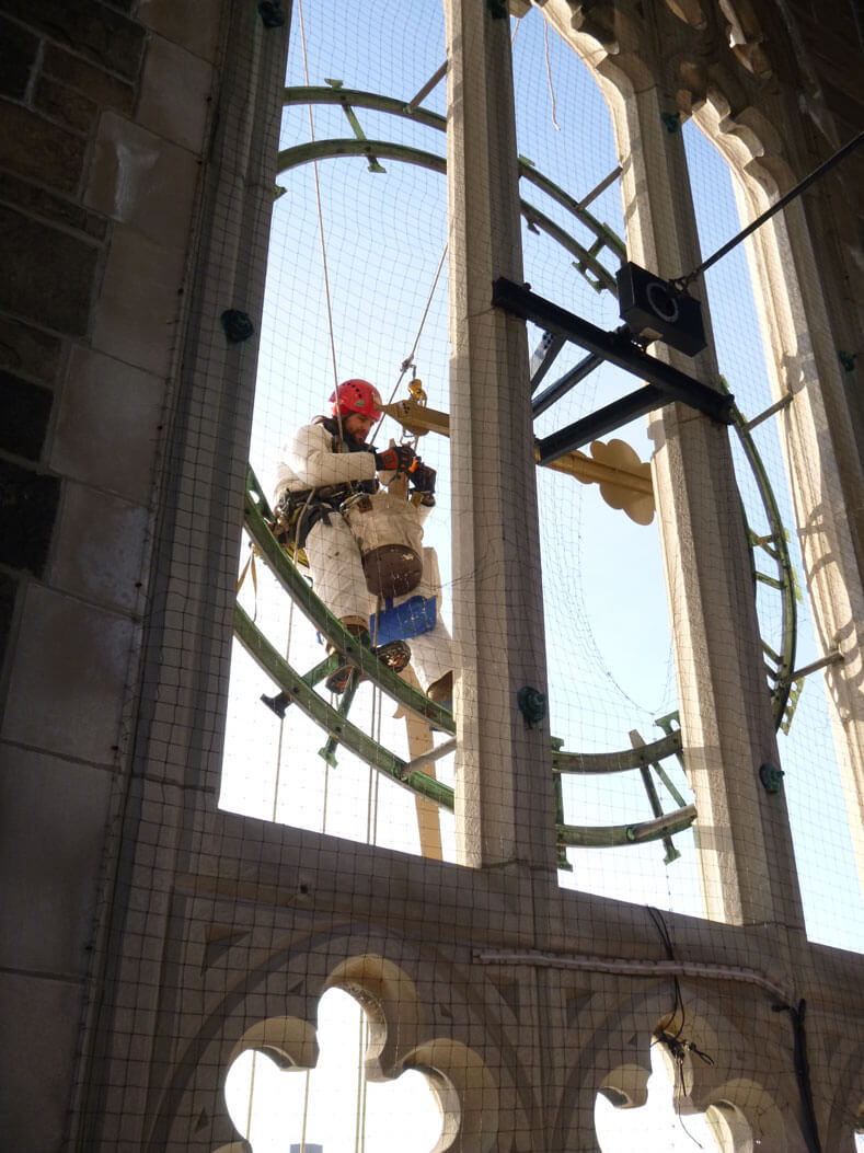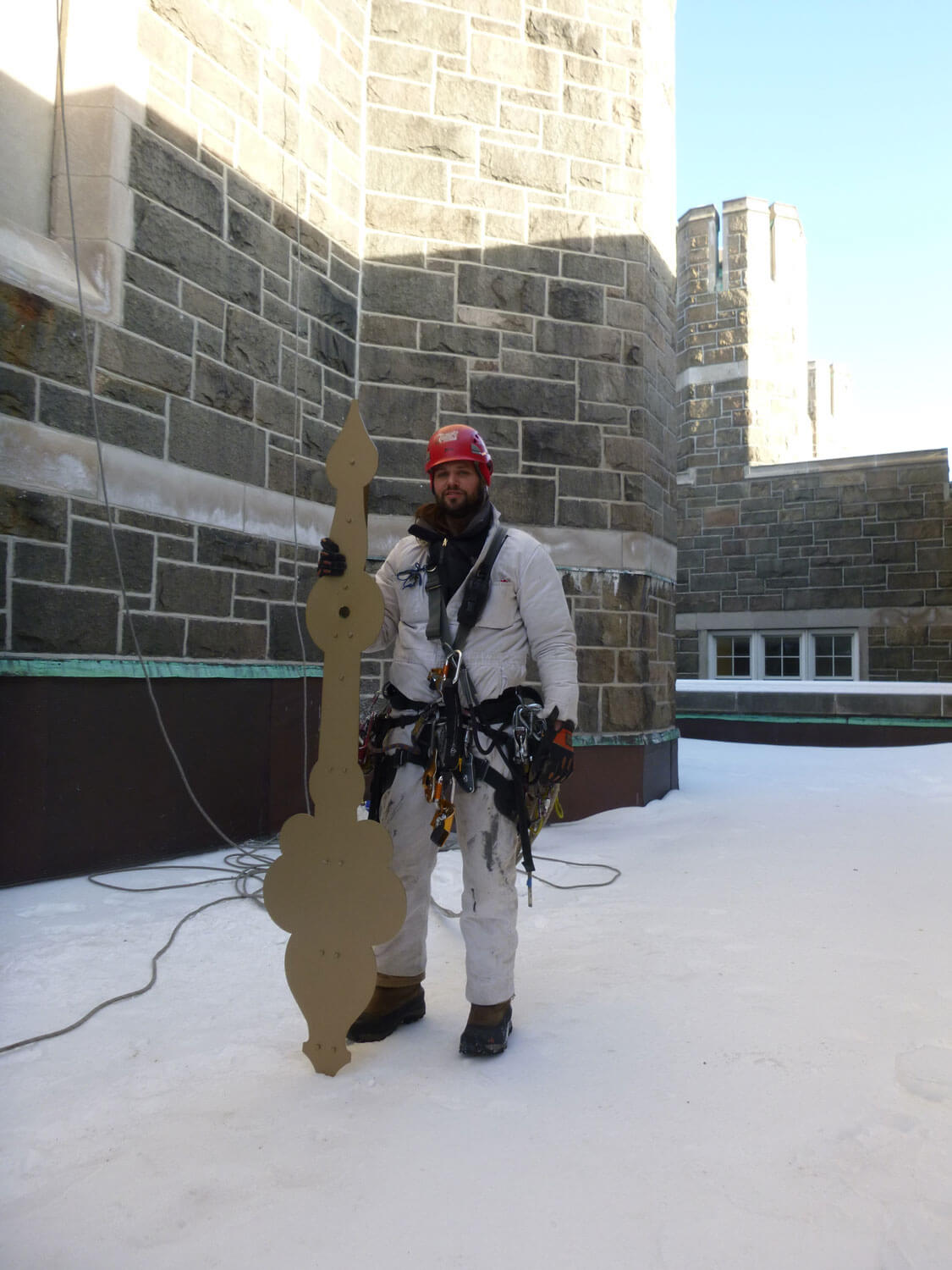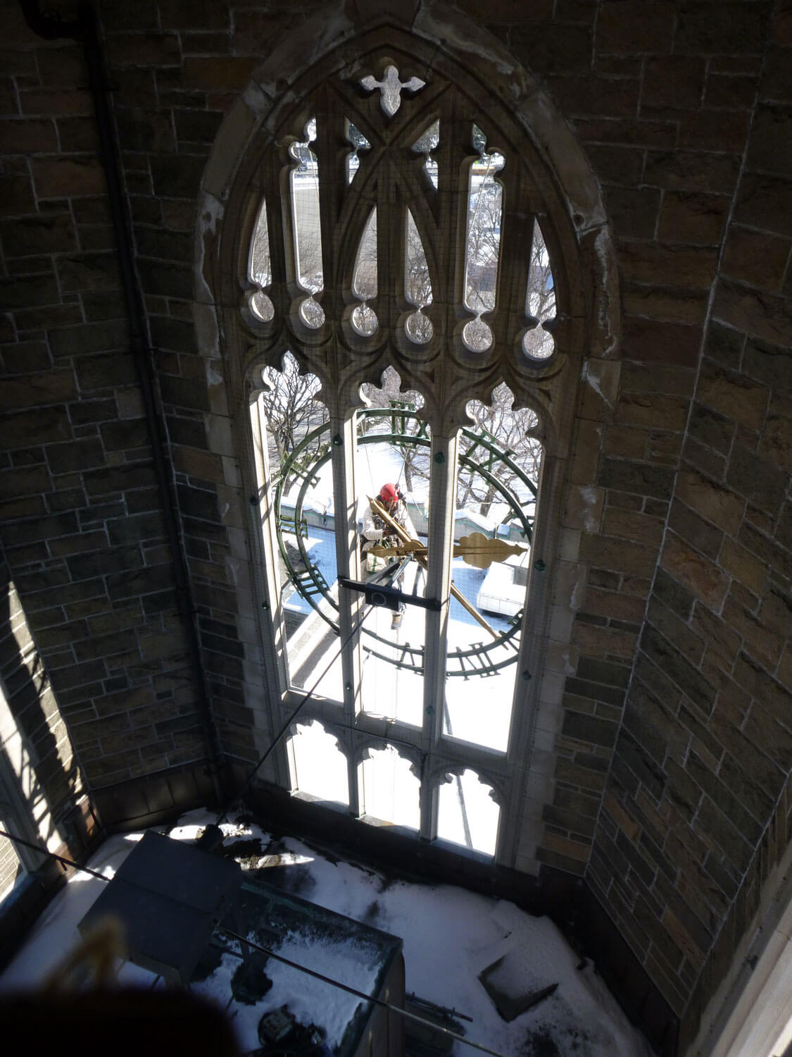 - Used Industrial Rope Access to allow a technician hands-on access to clock hands and gear boxes. This access approach allowed work to take place without disrupting student and staff access to campus buildings and without the construction of costly scaffolding.