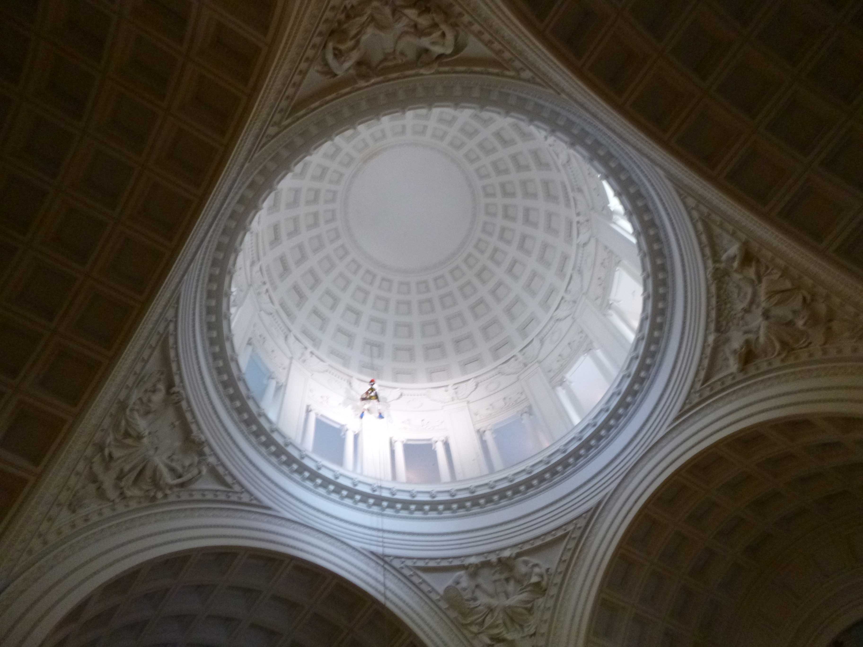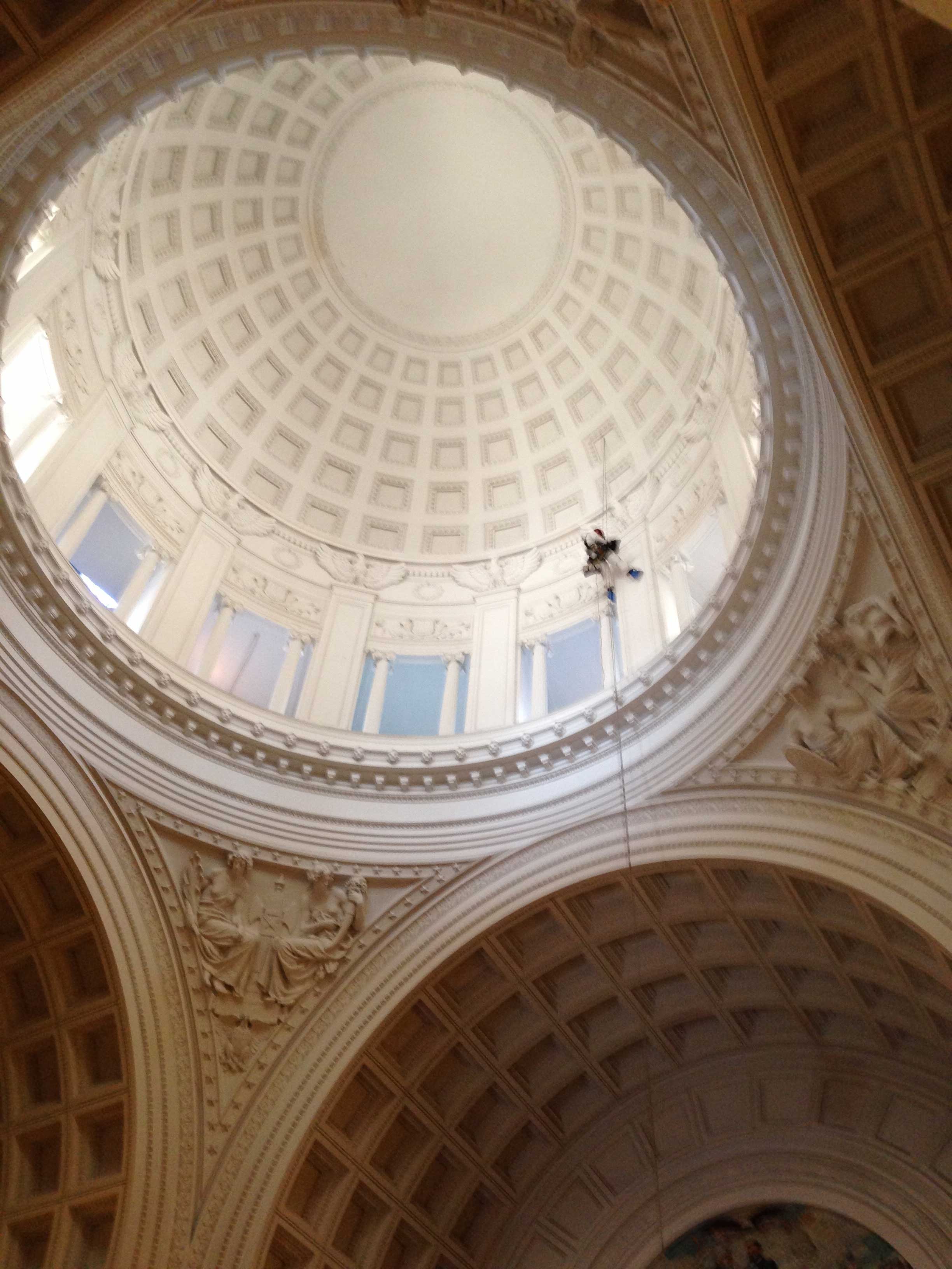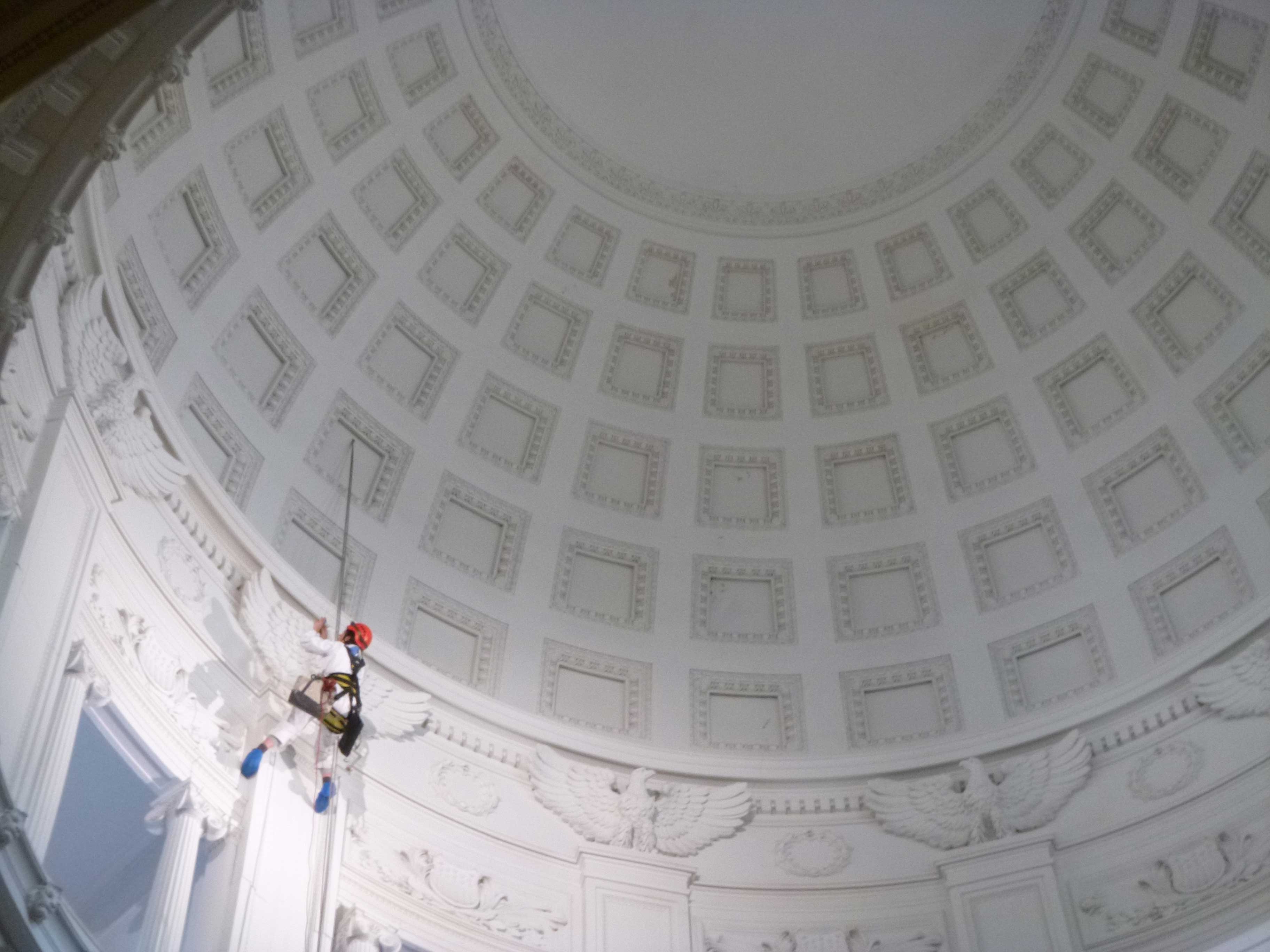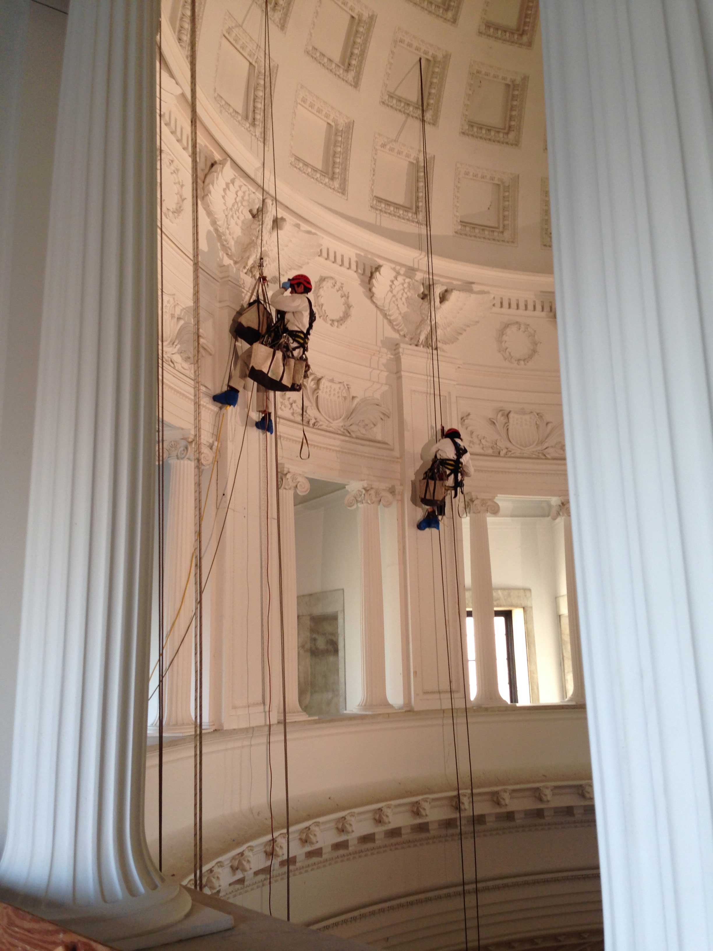 • Layout rigging in attic above interior dome to position rope access drops directly in front of pilasters.