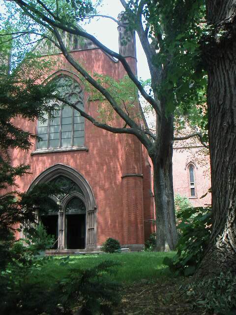 The Chapel of the Good Shepherd on the grounds of the General Theological Seminary with its 130-foot tall bell tower was designed and built in the Gothic Revival style between 1886 and 1888.