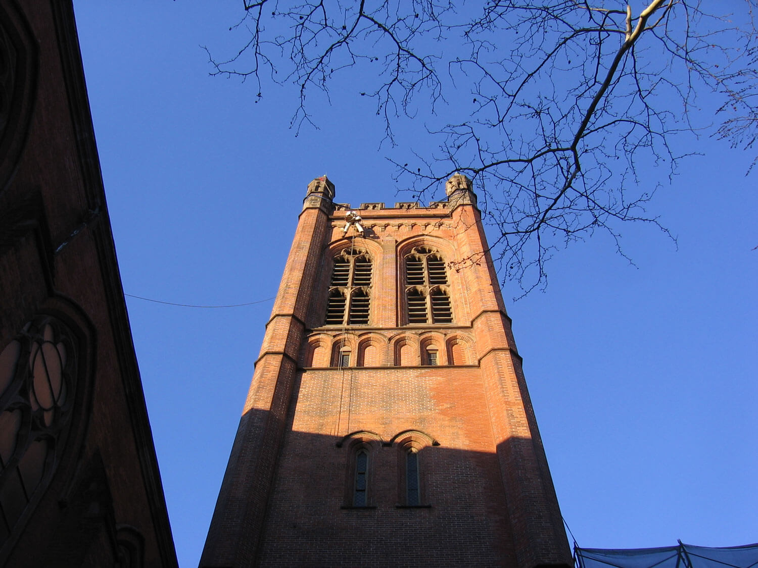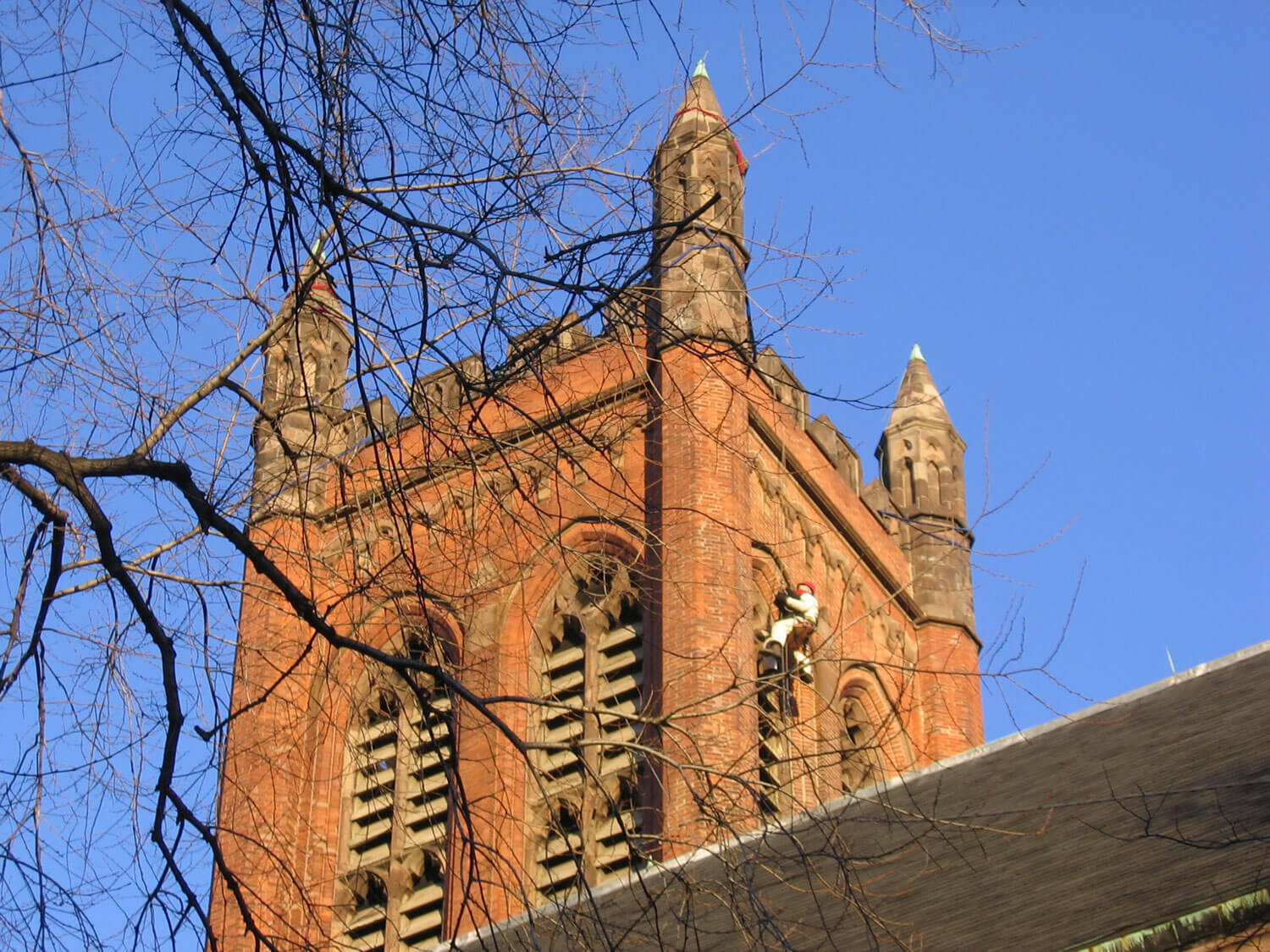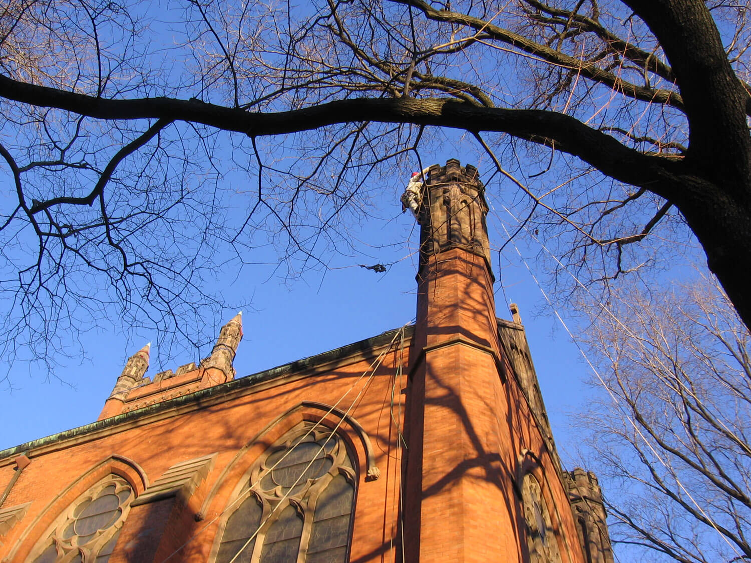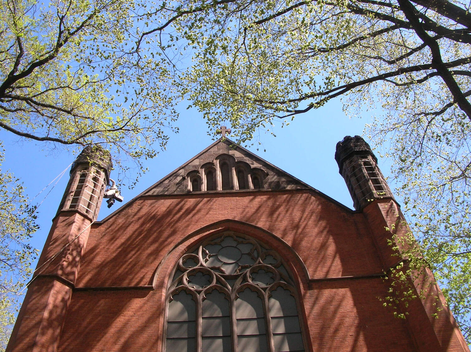 A distinguishing feature of both the Chapel and tower are the octagonal turrets at the corners of each of the structures. At the Chapel, the brick turrets are topped by blind crenellations constructed of brownstone. At the tower, the brownstone turrets consist of ashlar units at the level of the crenellated parapet, with a series of blind lancets encircling each turret topped by a short spire.