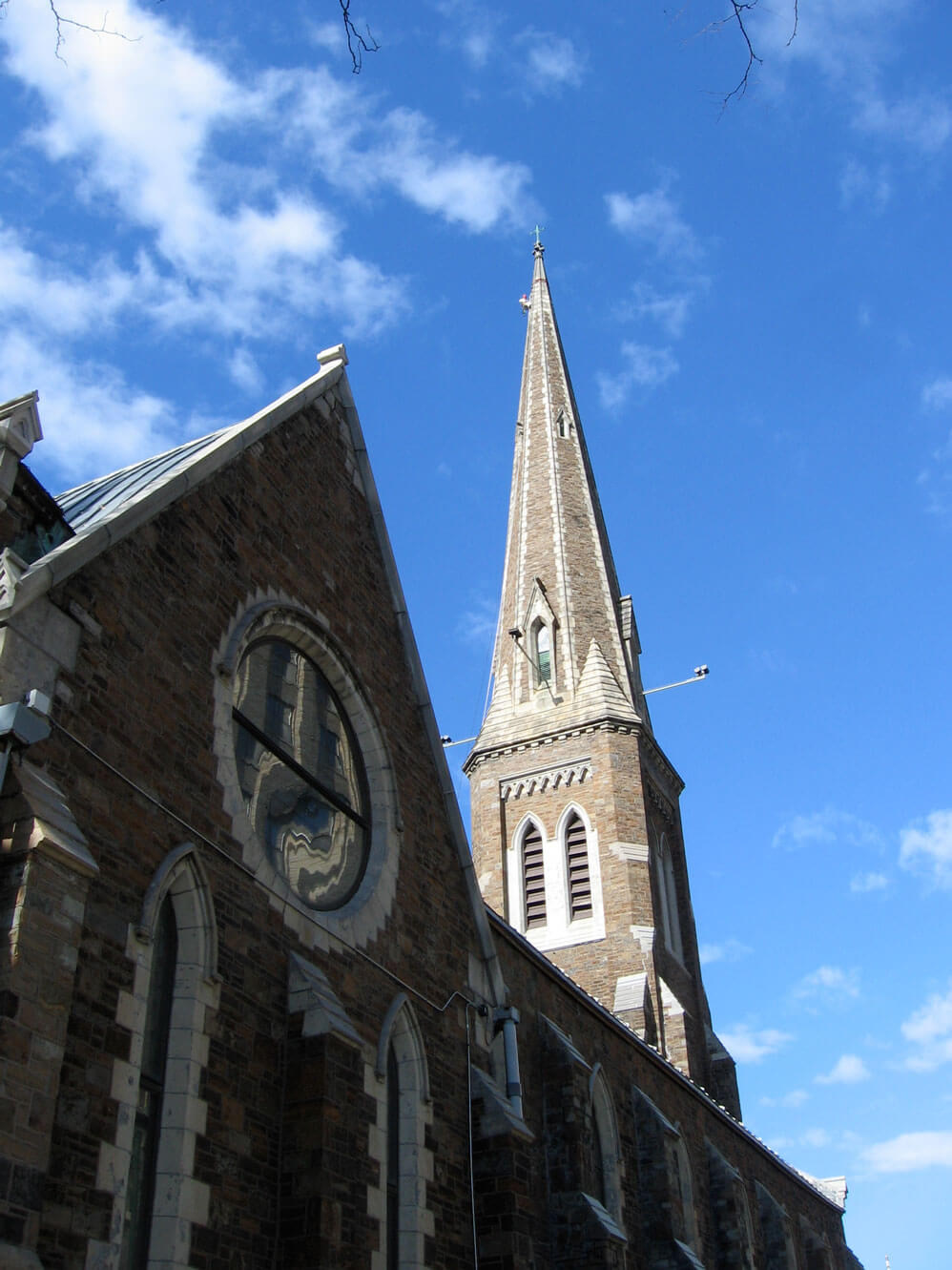 The octagonal spire of the Gothic Revival church sits atop a square plan tower and is capped by a copper cross finial to stand 216 feet tall. The spire is built of locally quarried rough-cut sandstone with granite trim. The square plan tower below consists of the same rough-cut sandstone with limestone wash surfaces and window surrounds.