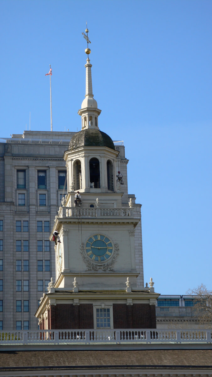 The Independence Hall Tower today stands as a recognizable symbol of both the first steps in the founding of the United States and of early efforts to preserve the cultural heritage of the nation. The Tower consists of a square masonry base, engaged on its north façade with the main block of Independence Hall, on top of which rises a wooden steeple. The steeple, designed and constructed in 1828 to recall the original wooden tower steeple, consists of a square clock level and cupola base, an octagonal cupola which serves as the Tower belfry, a smaller octagonal lantern and shingled spire section, and finally the wrought iron and sheet metal weathervane assembly at the top of the Tower. Although the Baroque/Gibbsian and Georgian architectural elements of Independence Hall and the adjoining Tower reflect mainstream English design fashions of its time, the historical events associated with the structure are more closely connected to the revolutionary beginnings of the United States. As such a powerful symbol of American historical and political events, Independence Hall and its Tower have been the focus of numerous preservation plans, including one of the first large-scale restoration projects undertaken in the rebuilding of the steeple and numerous subsequent repair and stabilization campaigns. The documentation and assessment of the Tower performed by Vertical Access was undertaken as part of a historic structure report developed in preparation for the continued preservation of the Tower’s structural, material and mechanical systems.