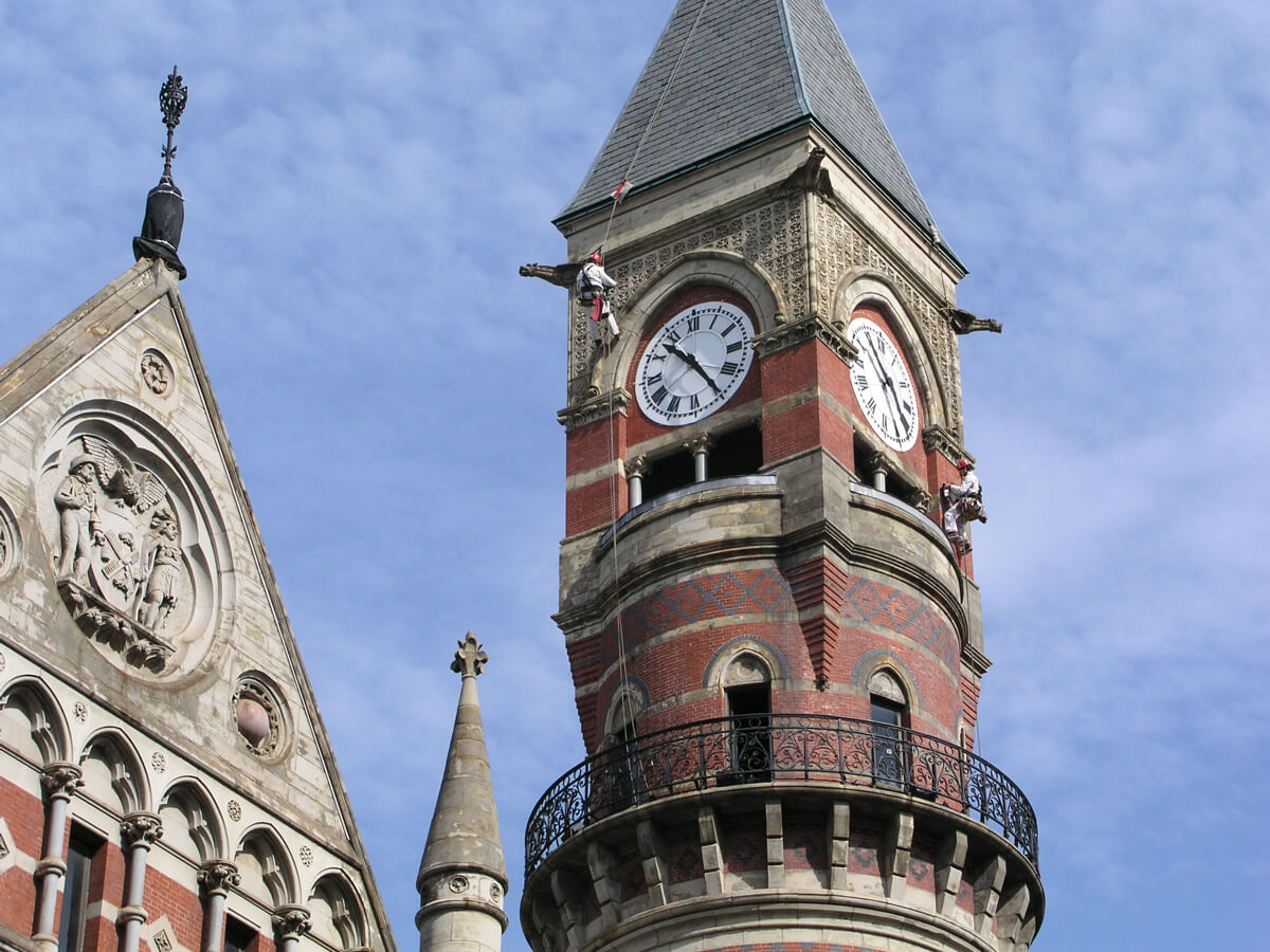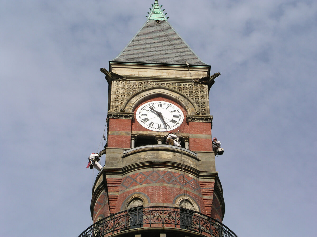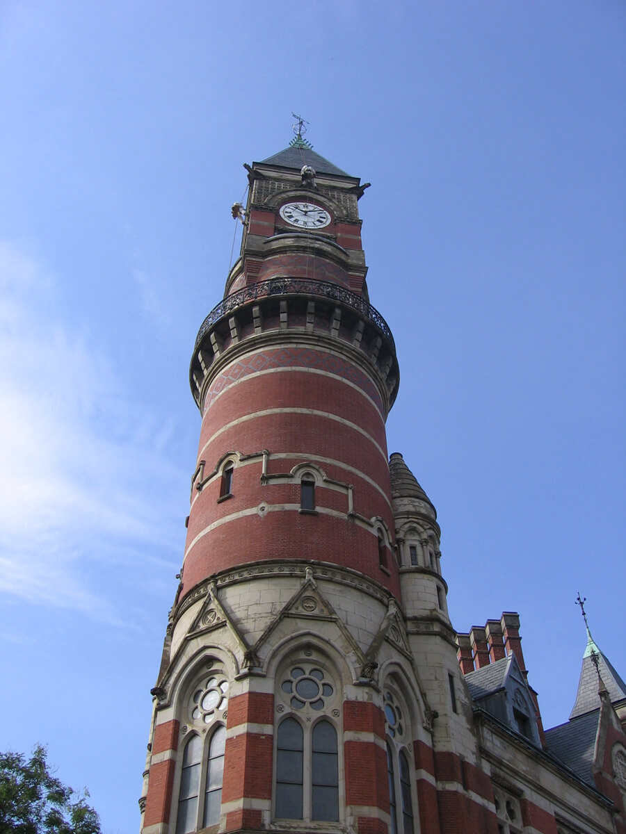 The 171-foot tall clock tower at the northeast corner of the building originally served as both a fire watch and bell tower. Like the rest of the adjoining structure, it is constructed of load-bearing masonry faced with Philadelphia red brick and sandstone from Berlin, Ohio. The upper portion of the bell tower consists of a stone balcony with iron railing, belfry, clock level and pyramidal roof. Distinctive features of the upper portion of the clock tower include the diamond-pattern effect of black painted brick at the balcony level, corbelled brick corners at the transition from the cylindrical tower to the square belfry, polished granite columns at the belfry, quatrefoil-motif sandstone ornament at the clock level, gargoyles at the corners of the tower below the roof, the slate pyramidal roof and a copper sheet metal cap with wrought iron finial at the peak of the tower roof.
