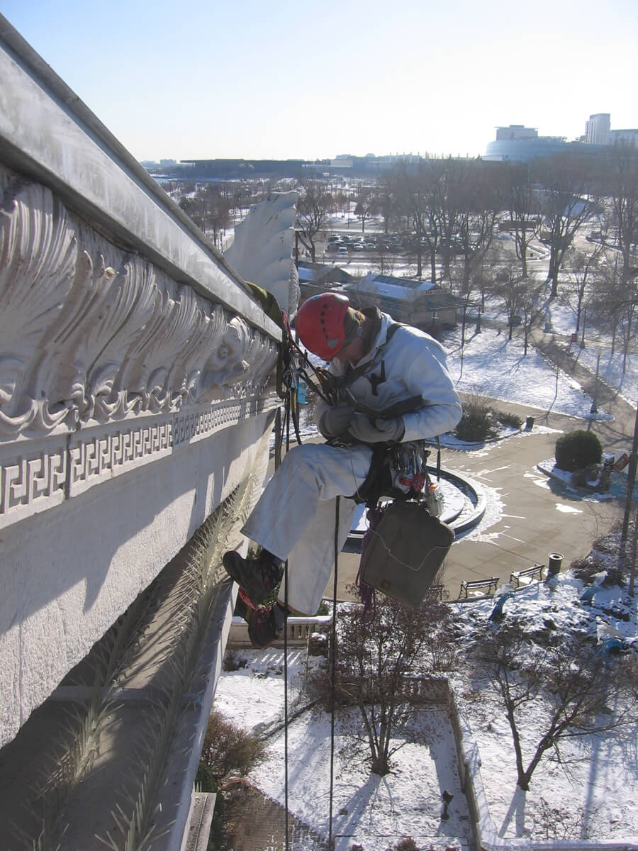 - Close visual examination and hammer-sounding of masonry at exterior façades.