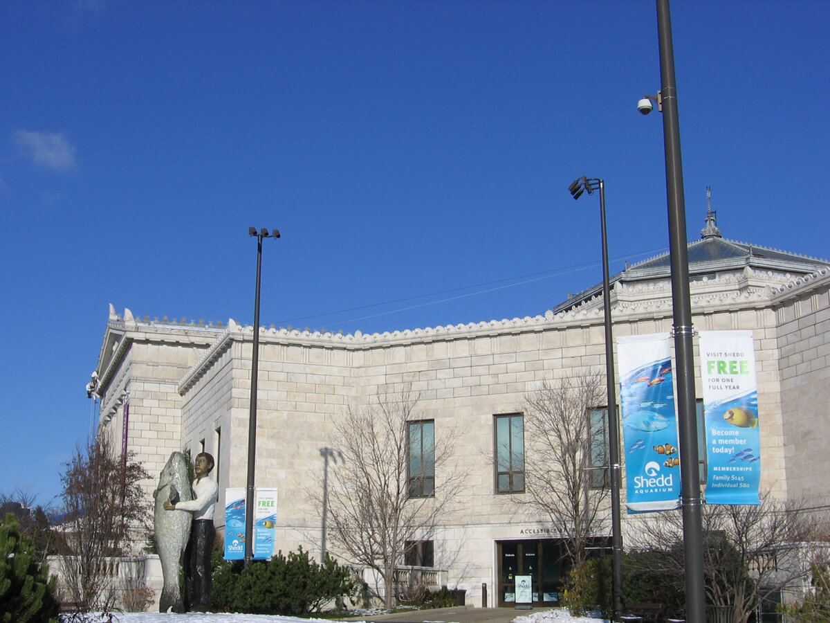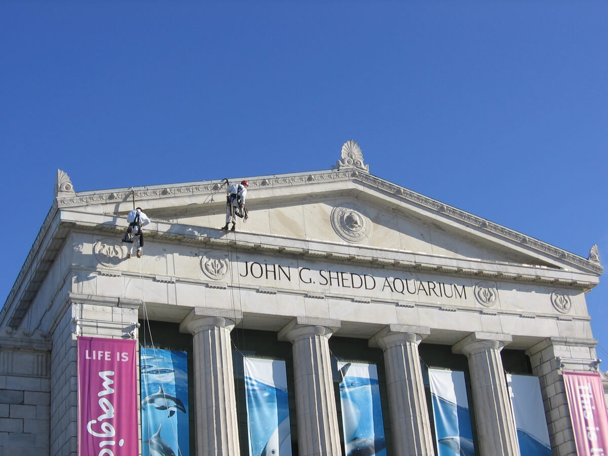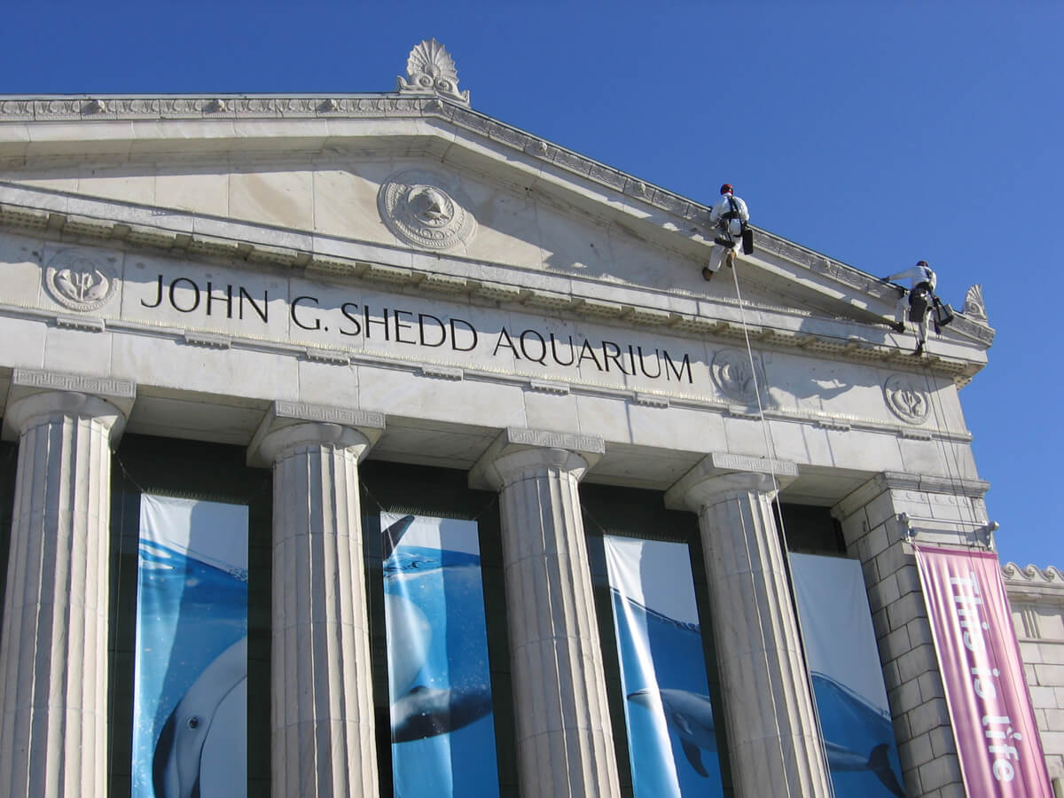 Shedd Aquarium was the gift of John G. Shedd to the city of Chicago. Designed by the Chicago architectural firm of Graham, Anderson, Probst & White in 1925, the aquarium was opened in May, 1930. The building is situated in the Museum Campus area of Grant Park, adjacent to the field Museum and near the Adler Planetarium. Like the Field Museum, Shedd Aquarium was designed in the Beaux Arts style, with classical Greek forms and ornamentation. The original building consisted of a central eight-sided rotunda with projecting wings at the cardinal directions. In 1991, a new structure, the Oceanarium, was added on the east side of the building engulfing the original east wing. The exterior of the original building is constructed of masonry, with cast lead ornament at the roof of the rotunda. Most of the exterior masonry, including the Doric columns at the main entrance on the west façade, is white marble from Georgia. Terra cotta is used at the cornice throughout the building and for decorative panels on the porticos of the north and south wings.