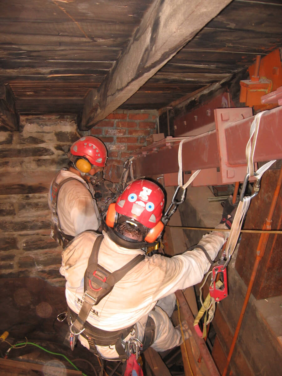 The original roof framing consists of timber trusses spanning across the width of the sanctuary in a north-south direction. There are several generations of additional strengthening interventions at the roof and ceiling framing visible in the attic, including steel tubes attached by means of angles to the original wood trusses, with tie rods. Both the original wood trusses and the companion steel members are embedded in brick masonry at their ends where they bear on the exterior walls of the church.