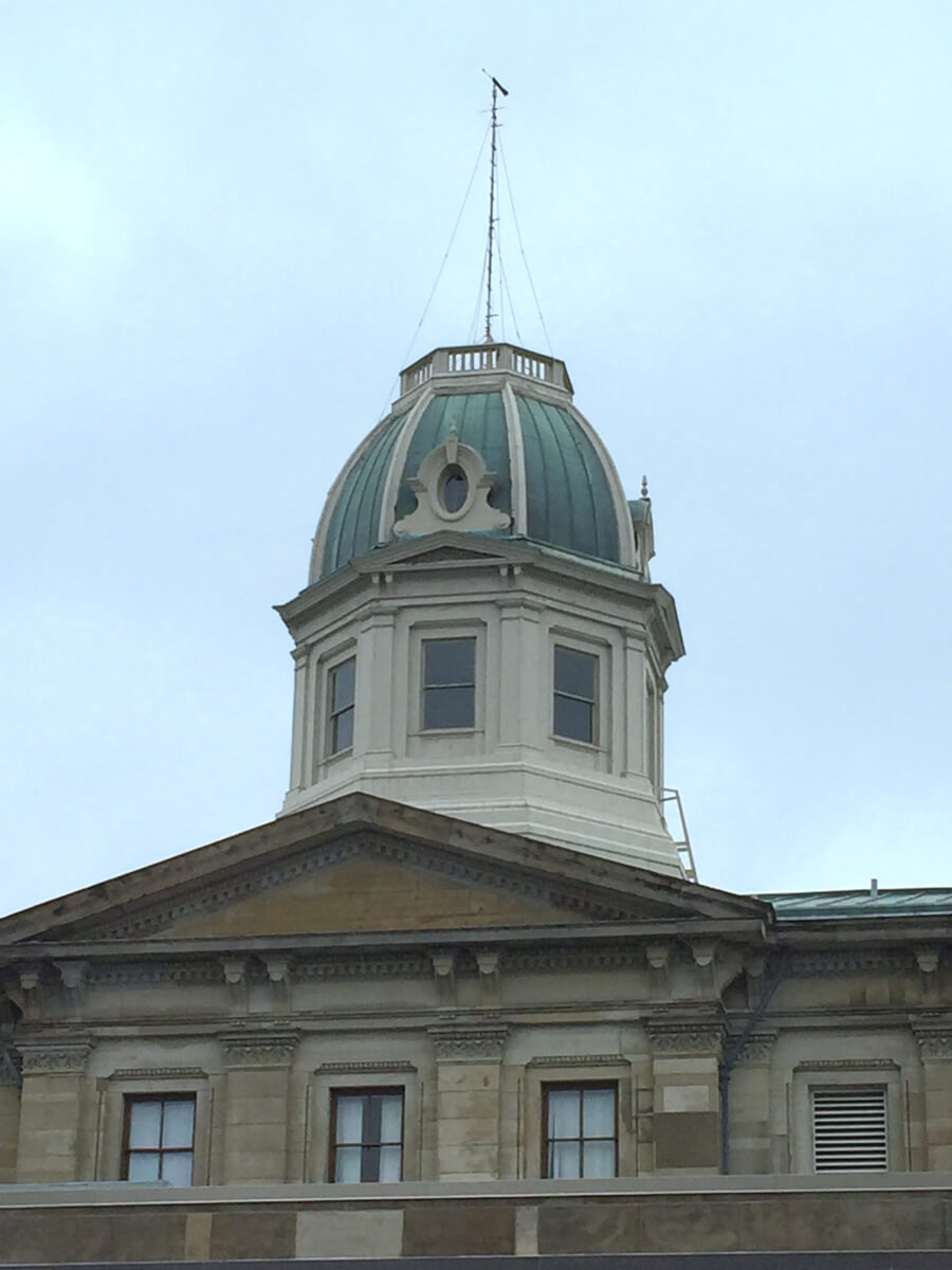 The Port Huron Federal Building was designed by Alfred B. Mullett, Supervising Architect for the United States Treasury Department, and constructed between 1873 and 1877. Designed in the Renaissance Revival style, the building is the oldest federal building in Michigan that is still occupied by the federal government. The classically detailed exterior features an octagonal cupola that sits on top of the three-story masonry base of the building where two gable roof sections cross. The cupola has wood framing and exterior cladding of unpainted copper and painted wood. The base of the cupola is clad in “Osborn’s Guaranteed Old Style” lead and tin coated sheet steel panels with folded seams. Above the base, the drum has large double hung windows, one on each of the eight facets, flanked by wood pilasters. The cornice between the dome and drum of the cupola has pediments on the four sides with the oculus windows. The unpainted sheet copper clad cupola dome above the drum flattens near the top and is surmounted by a wooden balustrade. There are wood-framed with wood sash, four-light oculus windows with ornamental wood window surrounds on four sides of the dome.