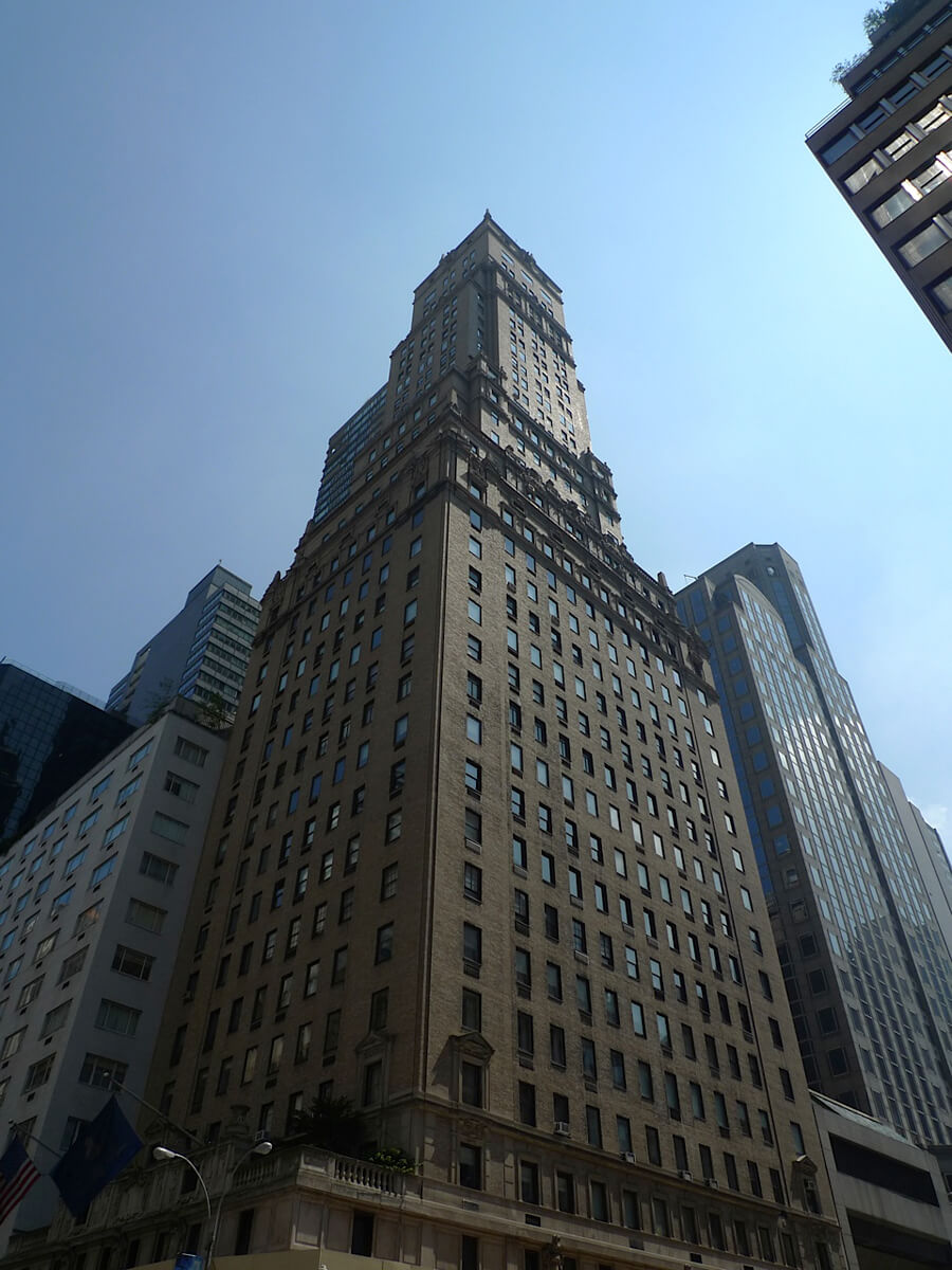 Constructed in 1925, the Ritz Tower was designed as an apartment hotel by the prolific architect of luxury apartments, Emery Roth, and by Thomas Hastings of Carrère & Hastings. The 40-story steel frame structure was the tallest residential building in the world at the time of its construction. The exterior is comprised primarily of buff colored brick, with terra cotta and limestone trim and ornament. Five setbacks, highlighted by ornamental terra cotta, lead to a tower with a pyramidal roof crowned with a limestone lantern and obelisk. The building’s decorative details are derived from the sixteenth century Italian Renaissance.