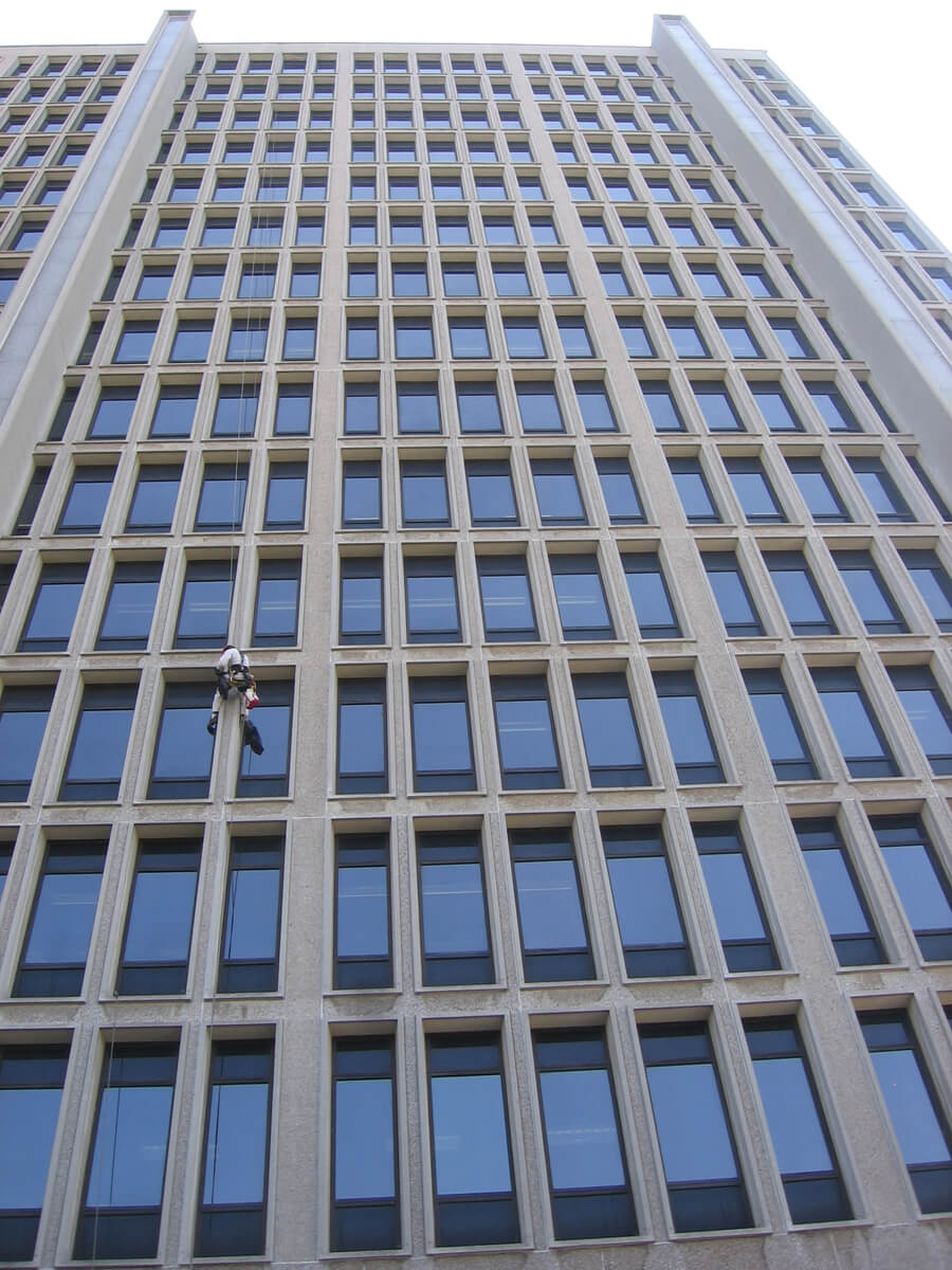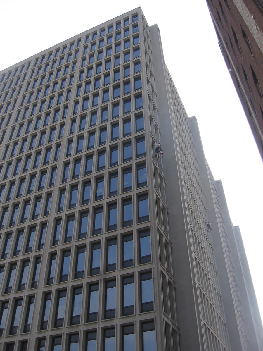 The surface of the panels has an exposed aggregate finish at the spandrels and piers and a smooth finish at the projecting window surrounds. Smooth-textured two-story tall pre-cast panels are used as cladding at the returns of the eight projecting columns on the north and south façades. The faces of the eight projecting columns are clad with polished granite panels.