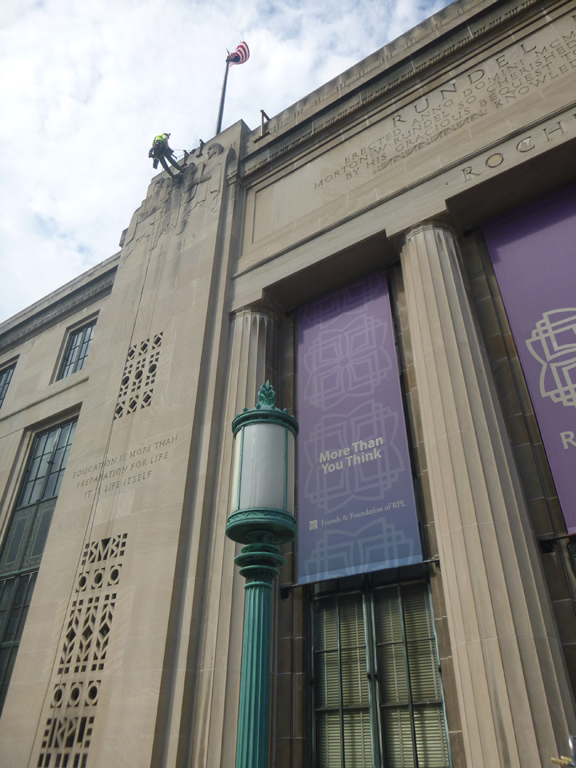 Vertical Access was retained by Bero Architecture, PLLC to assist the project team with the development of a comprehensive design for exterior repairs at Rundel Memorial Library in Rochester, NY by performing a survey and documenting existing conditions at the exterior façades and light court.