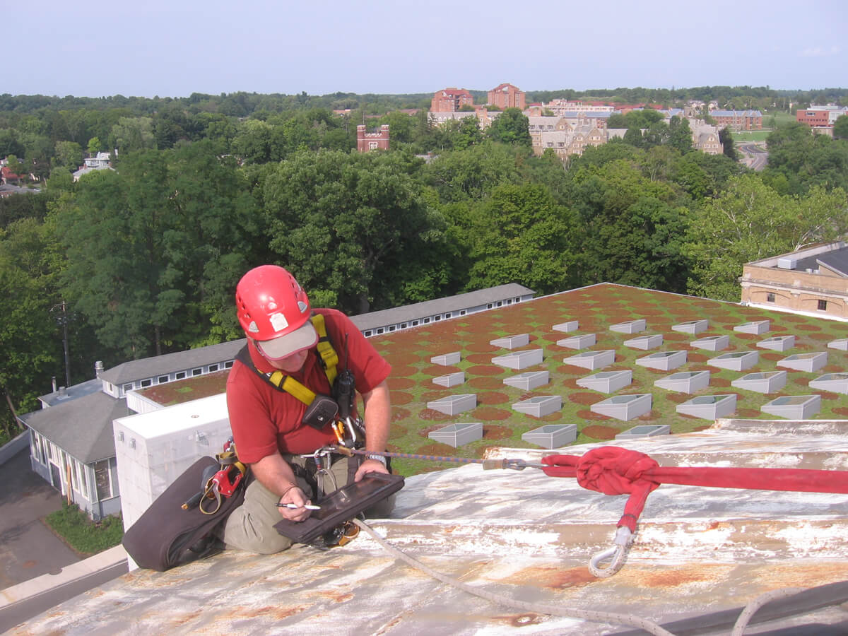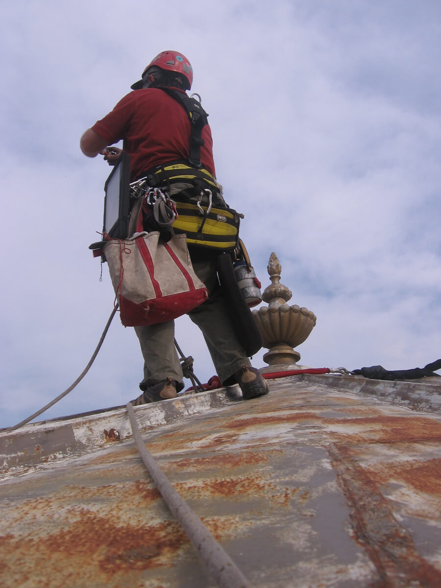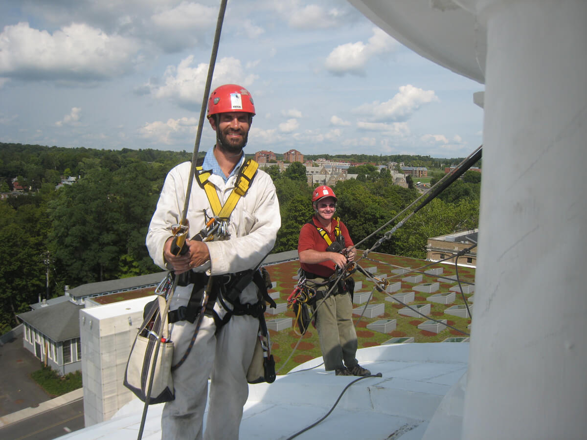 As part of a conceptual design phase study, Cornell University contracted with several design firms to evaluate the existing roofs and develop roof replacement options for nine buildings on its Ithaca campus. Vertical Access was retained by one of the consultants to perform a hands-on investigation of the dome of Sibley Hall as part of the study.