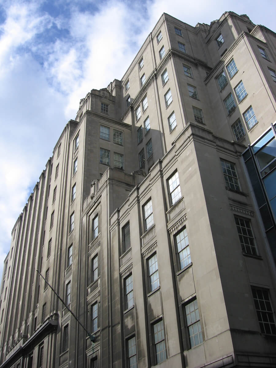 Each of the four facades has regularly-spaced window openings and piers. A series of setbacks at the corners of the building begin at the 5th floor and rise to the 11th floor. In the center of each façade, there are setbacks at the 11th and 13th floors. The design of the building has neo-classical and art deco touches that are expressed only modestly on the exterior. The little ornamentation that is found on the exterior consists of molded profile wash courses at the setbacks, crenels with crests at some of the parapets and decorative spandrel panels at the 5th and 10th floors.