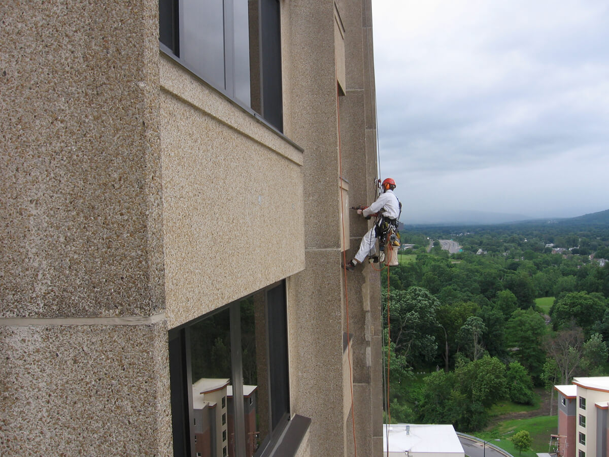 In 2007, VA performed the close visual examination of two residence halls: Lawrinson Hall and DellPlain Hall. Lawrinson Hall is a concrete structure with pre-cast concrete spandrel panels and column covers. DellPlain is a curtain wall structure with enamel spandrel panels and limestone column covers.