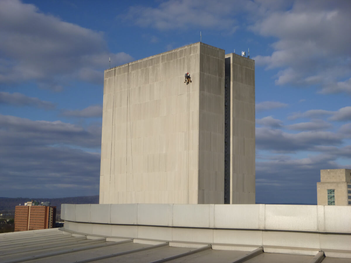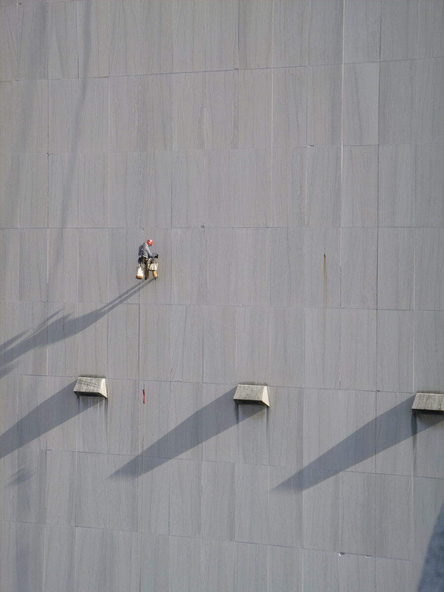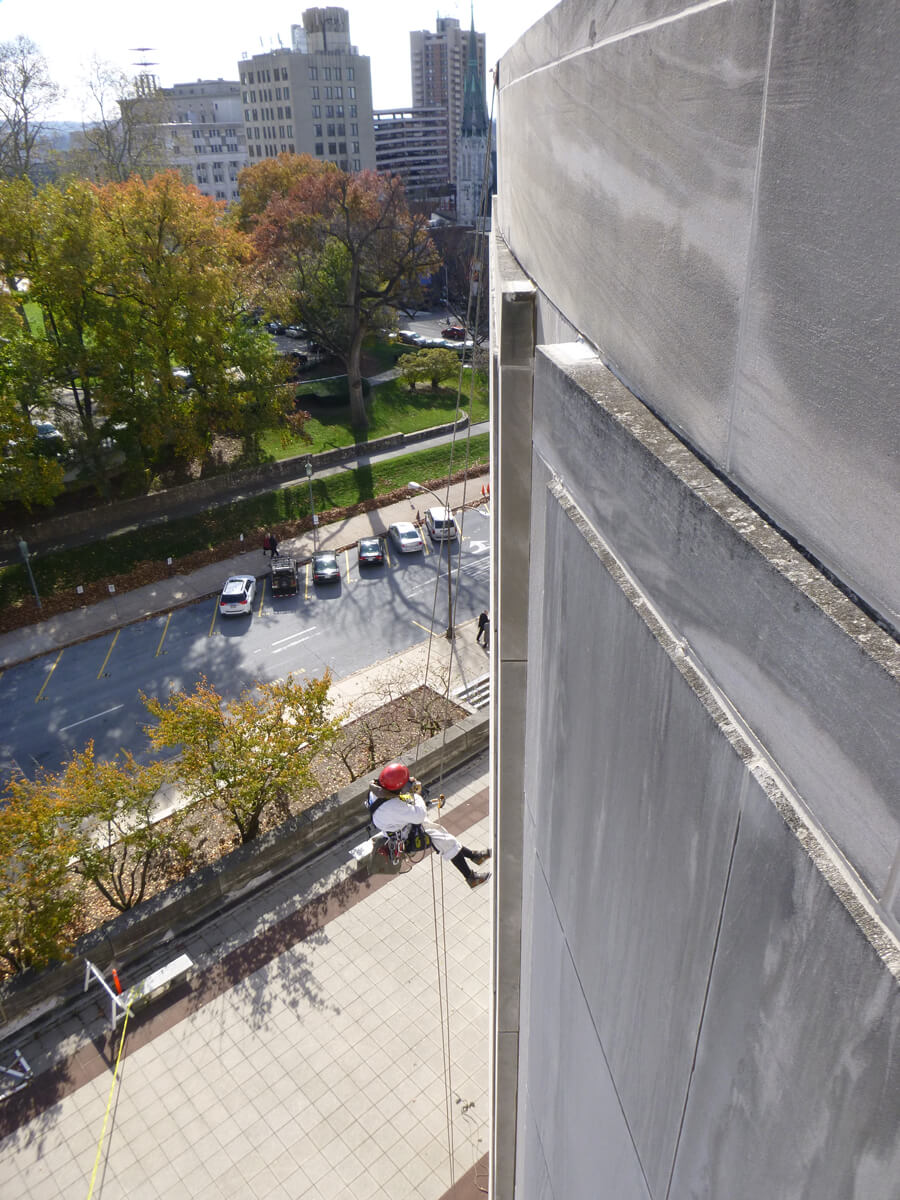 - Close visual examination and hammer-sounding of limestone cladding at exterior of buildings.