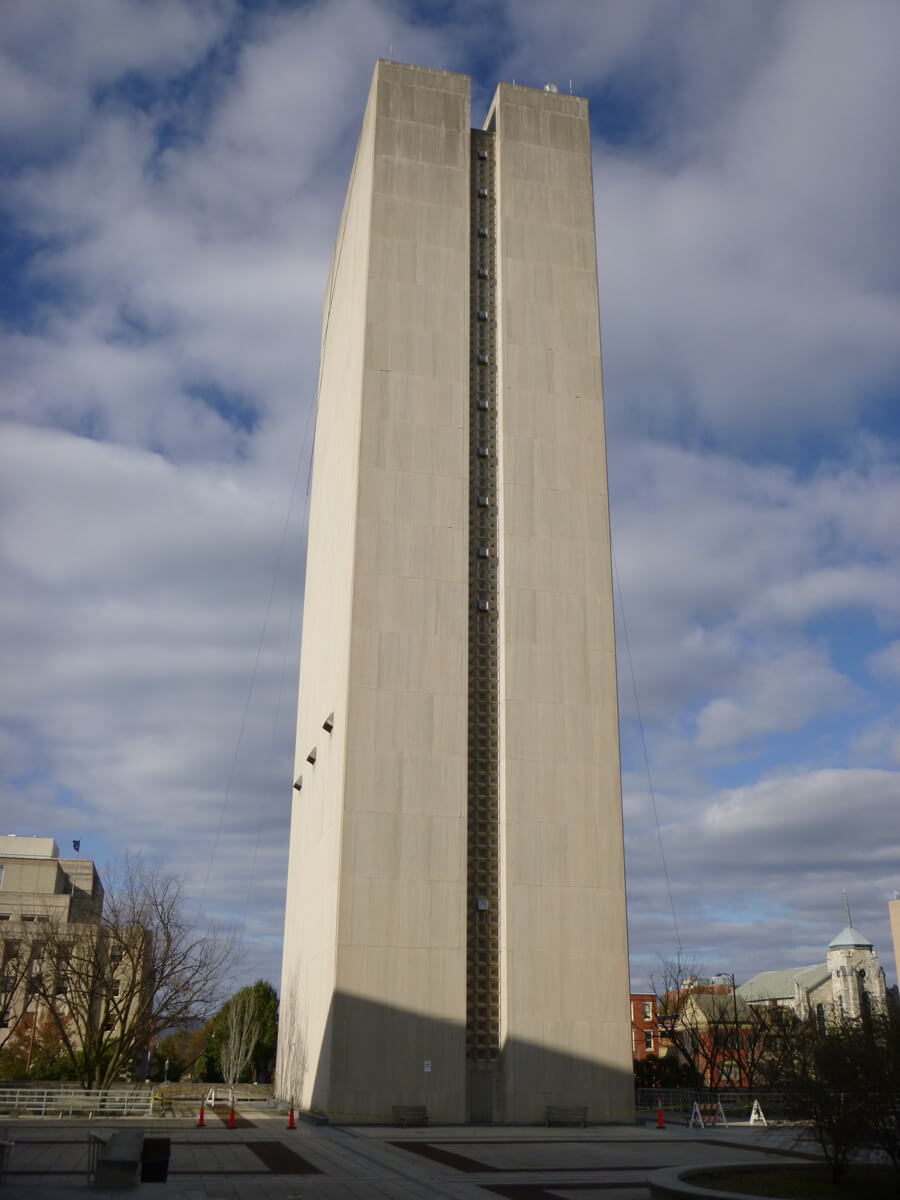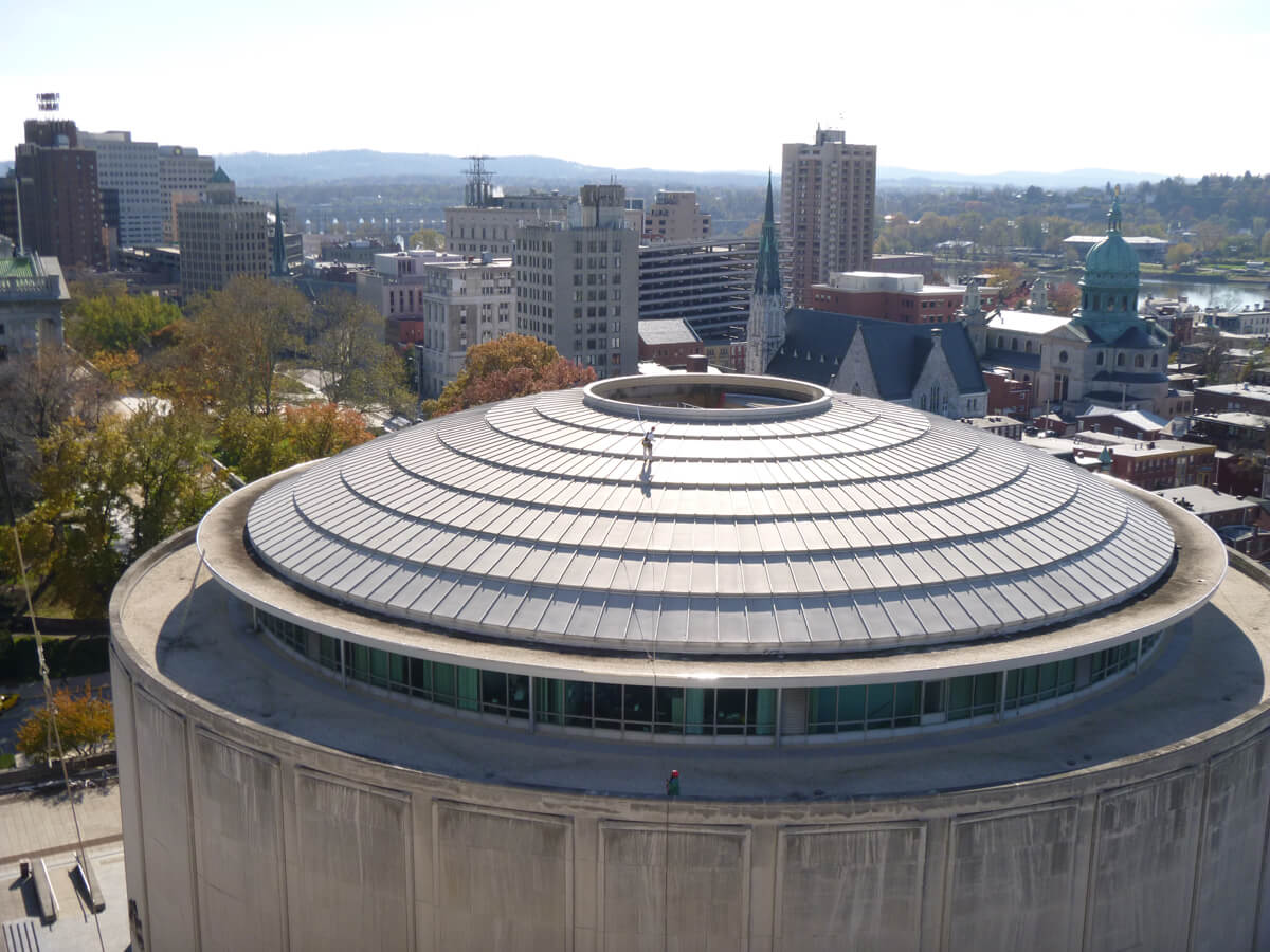 The State Museum of Pennsylvania and Pennsylvania State Archives are part of the Pennsylvania State Capitol Complex in downtown Harrisburg, PA. The five-story Museum is circular in plan, with 32 facets around the exterior. Each facet is comprised of four-story high panels of Indiana limestone units between the recessed limestone masonry at the column lines. The 22-story Archives building is a windowless rectangular slab, also clad in Indiana limestone panels.