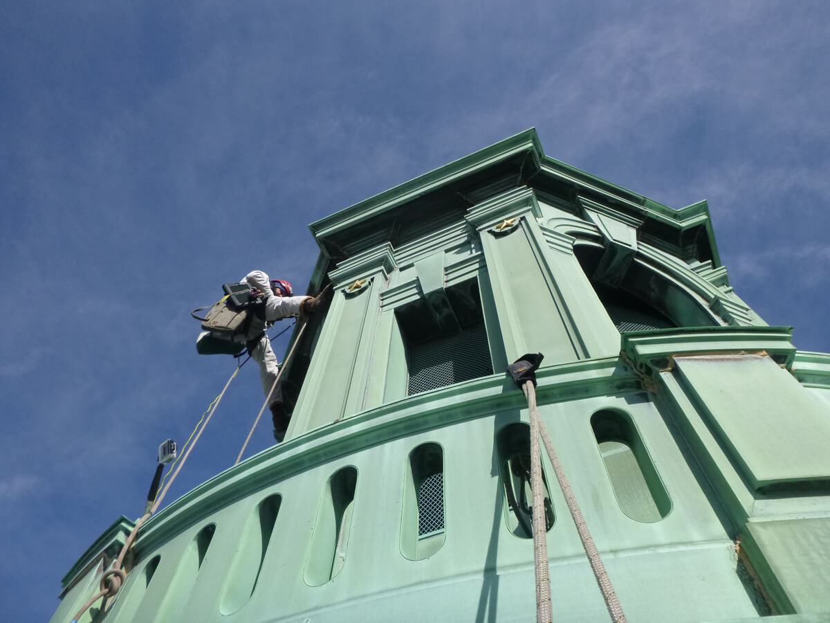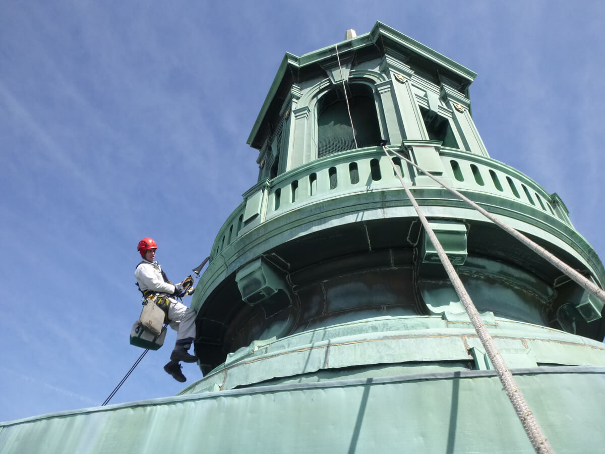 - Gain hands-on access to the sheet metal dome and cupola in order to document the condition of the sheet copper cladding.