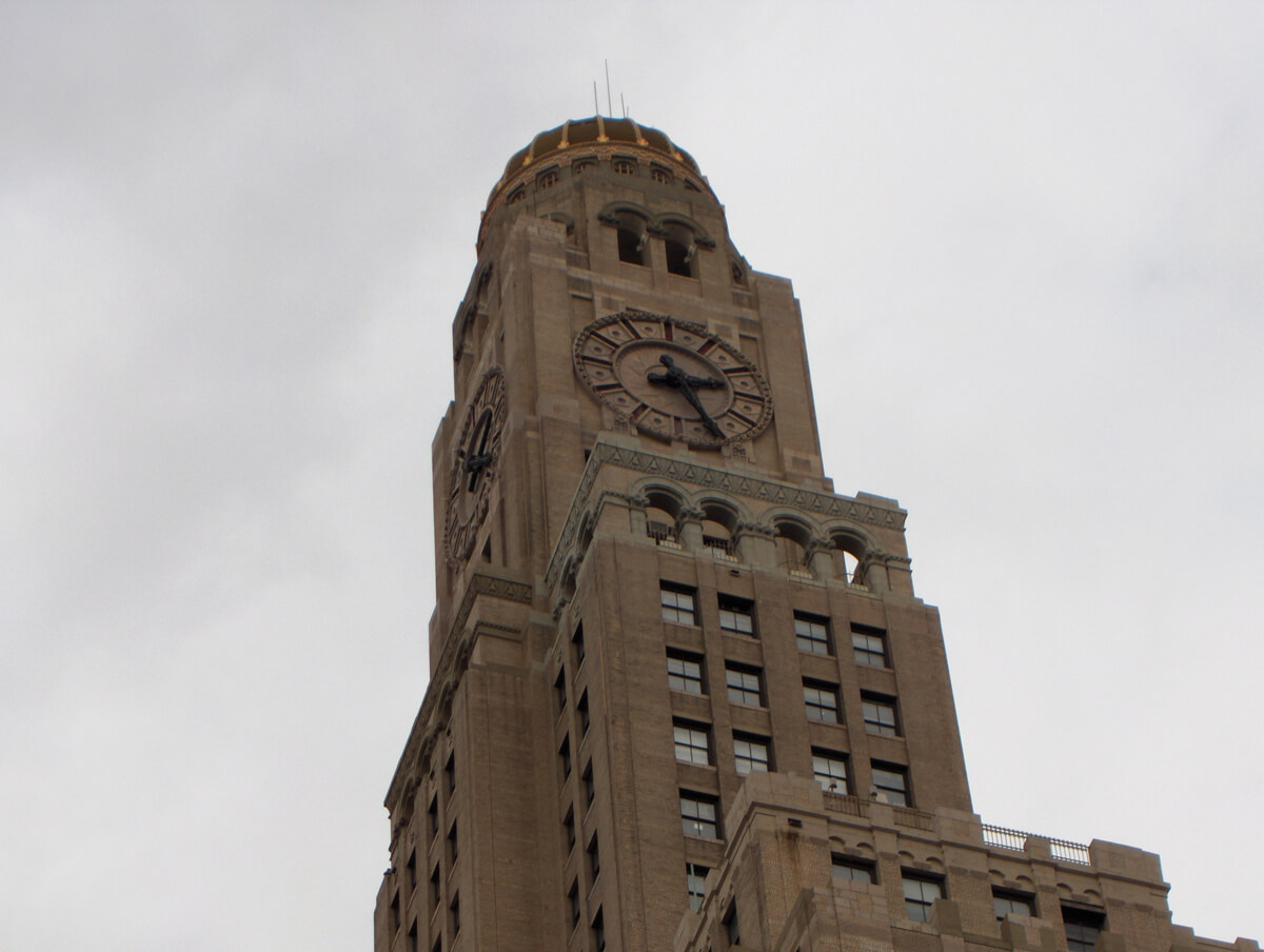 The Williamsburgh Savings Bank Tower was built in downtown Brooklyn, New York between 1927 and 1929. Designed in the Art Deco style, the building remains the tallest building in Brooklyn today with 34 stories and standing 512 feet tall. The exterior of the building includes a clock with faces on the four façades of the tower, which was the largest in the world from 1929 until 1962. It also features a gilded copper dome; carved lions, turtles and birds on the exterior; and a marble banking hall on the ground floor with 63-foot vaulted ceilings, 40-foot windows and elaborate mosaics.